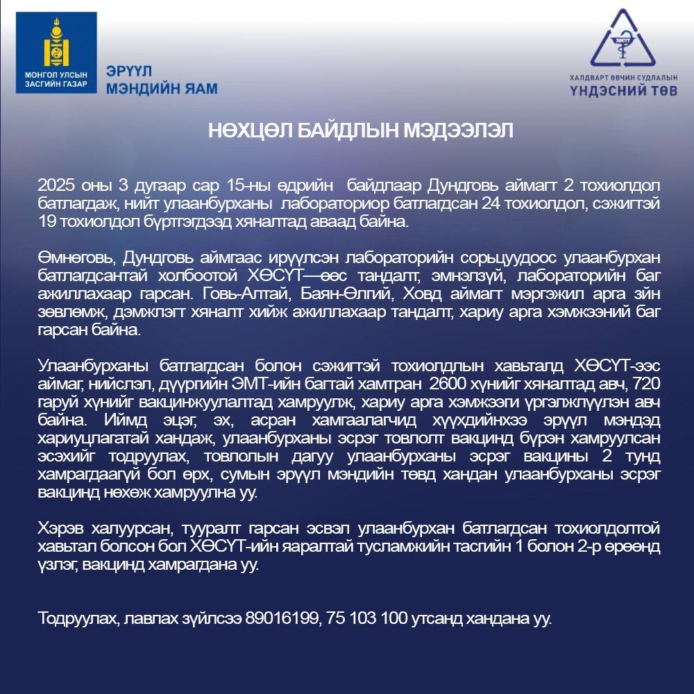 2025 оны 3 дугаар сар 15-ны өдрийн байдлаар Дундговь аймагт 2 тохиолдол батлагдаж, нийт улаанбурханы лабораториор батлагдсан 24 тохиолдол, сэжигтэй 19 тохиолдол бүртгэгдээд хяналтад аваад байна.