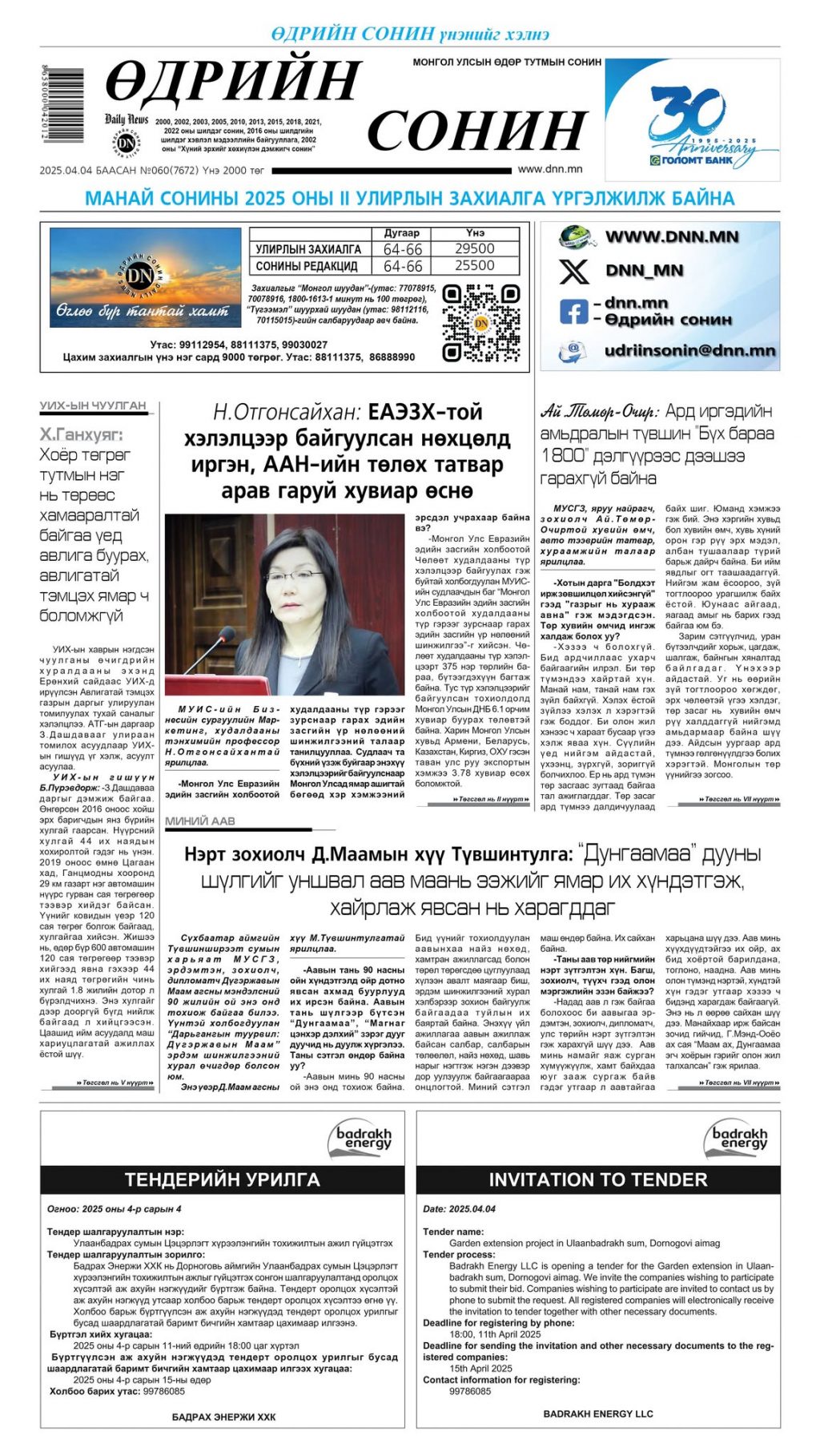 Эдгээр болон бусад цаг үеийн мэдээ мэдээлэл, ярилцлага, сурвалжлагыг “Өдрийн сонин”-ы мягмар гаригийн дугаараас уншаарай.