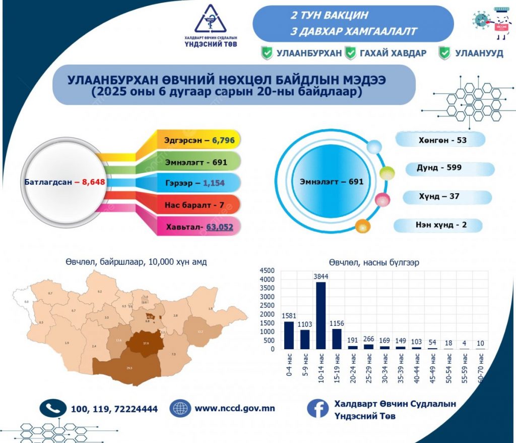 Халдварт өвчин судлалын үндэсний төвөөс улаанбурхан өвчний нөхцөл байдлын талаар мэдээлэл өглөө. Өнөөдөр буюу 2025 оны зургаадугаар сарын 20-ны байдлаар нийт улаанбурхан өвчний лабораториор батлагдсан тохиолдол 8648, эмнэлэгт хэвтэн эмчлүүлж байгаа 691, гэрээр 1154, эдгэрсэн 6796, хавьтал 63052, нас баралт долоо бүртгэгдээд байна.