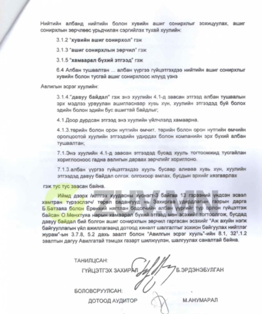 Мөн дотоод хяналт шалгалтын хүрээнд Б.Батзаяа, О.Мөнхтуяа нарын хууль бус үйлдлийг тогтоож, Нийтийн албанд нийтийн болон хувийн ашиг сонирхлыг зохицуулах, ашиг сонирхлын зөрчлөөс урьдчилан сэргийлэх тухай хуулийн 3.1.2, 3.1.3, 3.1.5, 6.4, Авлигын эсрэг хуулийн 3.1.4, 4.1, 4.1.3, 7.1, 7.1.3 дугаар заалтуудыг зөрчсөн хэмээн АТГ-т өгч шалгуулж байжээ. Гэвч ямар нэгэн байдлаар хариулцлага хүлээх нь байтугай ажлаа хийсээр өдийг хүрсэн байна.