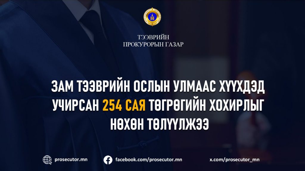 ЗАМ ТЭЭВРИЙН ОСЛЫН УЛМААС ХҮҮХДЭД УЧИРСАН 254 САЯ ТӨГРӨГИЙН НӨХӨН ТӨЛҮҮЛЖЭЭ