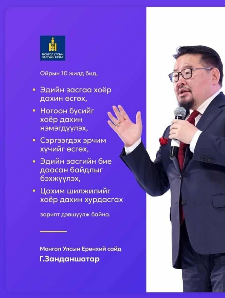 Одоо урьдчилан хөрөнгө оруулагчдадаа бизнесийнхэндээ гэнэтийн сюрприз барьдаггүй ярилцаж хэлэлцдэг механизмыг бий болгосон. Энэ бүх чиглэлүүд бол зөвхөн яриа биш. Өнгөрсөн Засгийн газрын хуралдаанаар ажлын хэсгүүд, шуурхай багуудыг томилж, эдгээр өөрчлөлт шинэчлэлтийг эхлүүлэх үүрэг даалгаврыг бүх сайд нар биелүүлнэ. Ойрын 10 жилд бид эдийн засгаа хоёр дахин өсгөх, ногоон бүсийг хоёр дахин нэмэгдүүлэх, сэргээгдэх эрчим хүчний хүчин чадлыг нэмэгдүүлэх, эдийн засгийн бие даасан байдлыг бэхжүүлэх, цахим шилжилтийг хоёр дахин хурдасгах зорилт дэвшүүлж байна. Ингэснээр үндэсний сэргэн мандлын шинэ давлагаа эрч хүчтэй эхэлнэ гэдгийг мэдэрч байна.