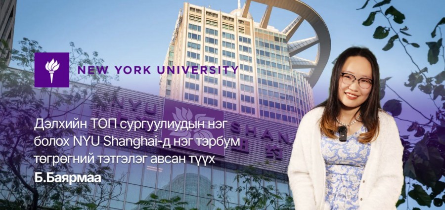 Дэлхийн топ 30 их сургуулийн нэг болох New York University –ийн харьяа NYU Shanghai-д Монгол охин 100 хувийн тэтгэлэгтэйгээр суралцахаар болжээ. Тус сургууль нь олон улсын оюутнуудаас маш бага элсэлт авдаг топ сургуулиудын нэг юм.