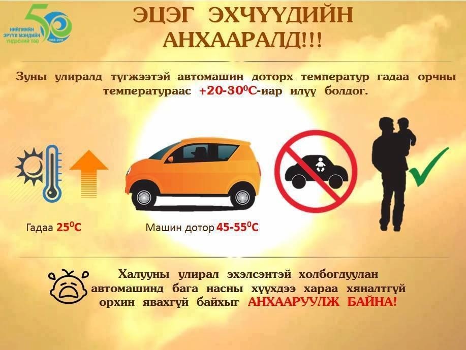 Тухайлбал гадаа +25 градус байхад түгжээтэй автомашин дотор +45-аас +55 градус хүрдэг тул бага насны хүүхдээ автомашиндаа хараа хяналтгүй үлдээх нь эрүүл мэнд, амь насанд нь эрсдэл учруулж болзошгүйг НЭМҮТ-өөс анхааруулав.