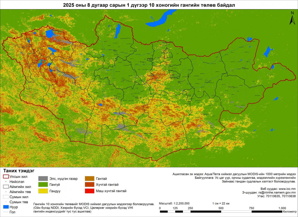 Ус цаг уур, орчны судалгаа, мэдээллийн хүрээлэнгийн Зайнаас тандан судлалын хэлтсээс “Aqua” хиймэл дагуулаар Монгол орны гангийн төлөв байдлыг орон зайн өндөр нарийвчлалтайгаар үнэлсэн байна.