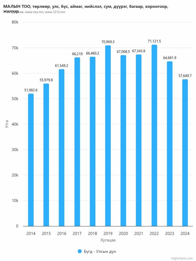 Малын тоо 2024 оны мал тооллогын дүнгээр улсын хэмжээнд нийт 57 саяд хүрэв. Сүүлийн хоёр жилд зуд болж, малын тоо буурсан ч 2022 он хүртэл жил бүр алгуур өслөө. Малын тоо өссөн ч малчдын амьжиргаа төдийлөн өөрчлөгдсөнгүй. Өмнө нь айл бүрийн гадаа нэг мотоцикл байсан бол одоо нэмээд нэг портер эсвэл приус бий.