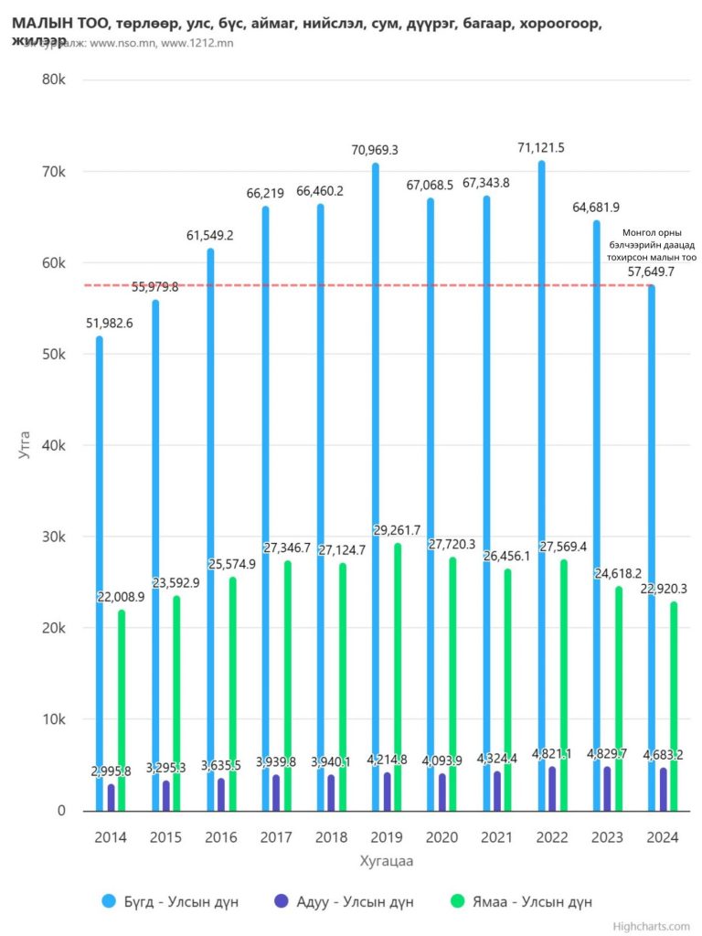 Манай орны бэлчээрийн даацад тохирсон малын тоо 57649,7 мянга байх ёстой. Гэвч 2016-2023 оны хооронд нийт малын тоо 57 саяас байнга давсныг дараах зургаас хараарай. 2025 оны мал тооллогын дүн хараахан гараагүй байна.