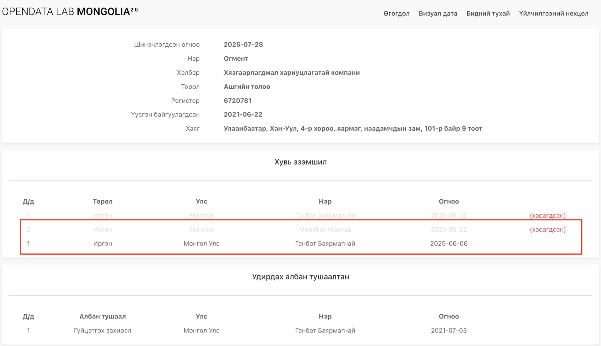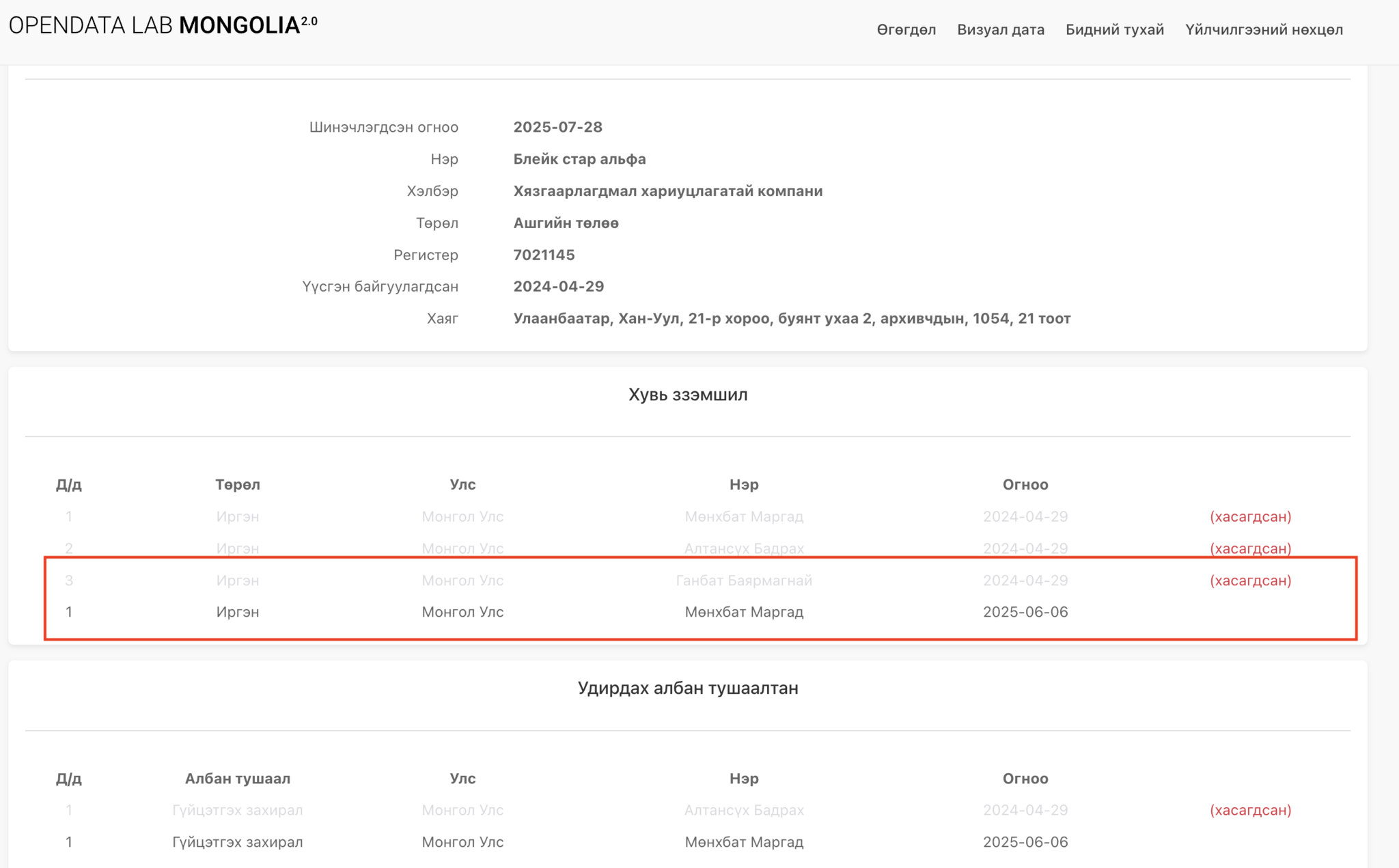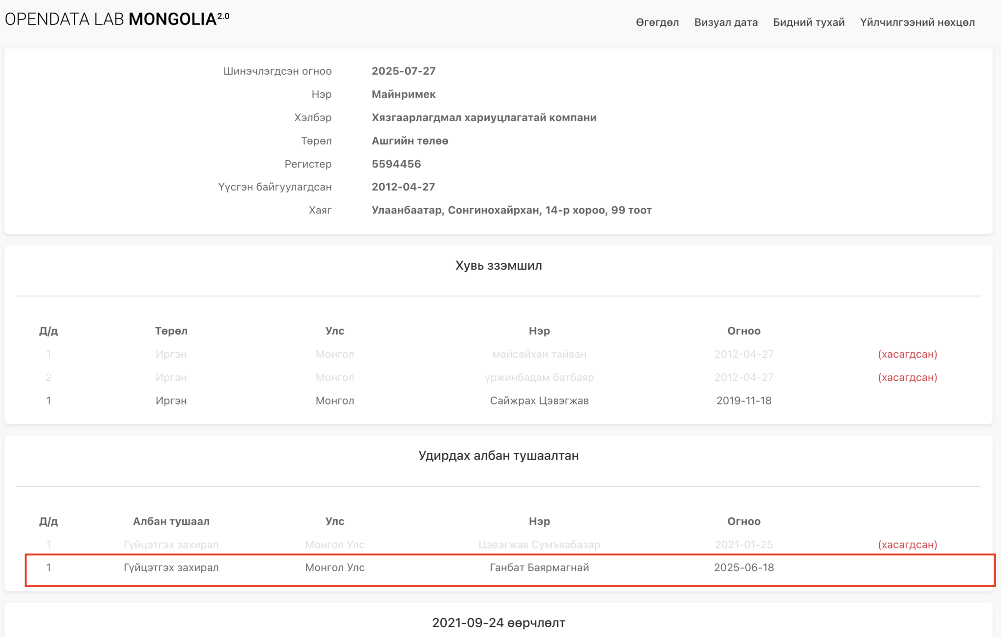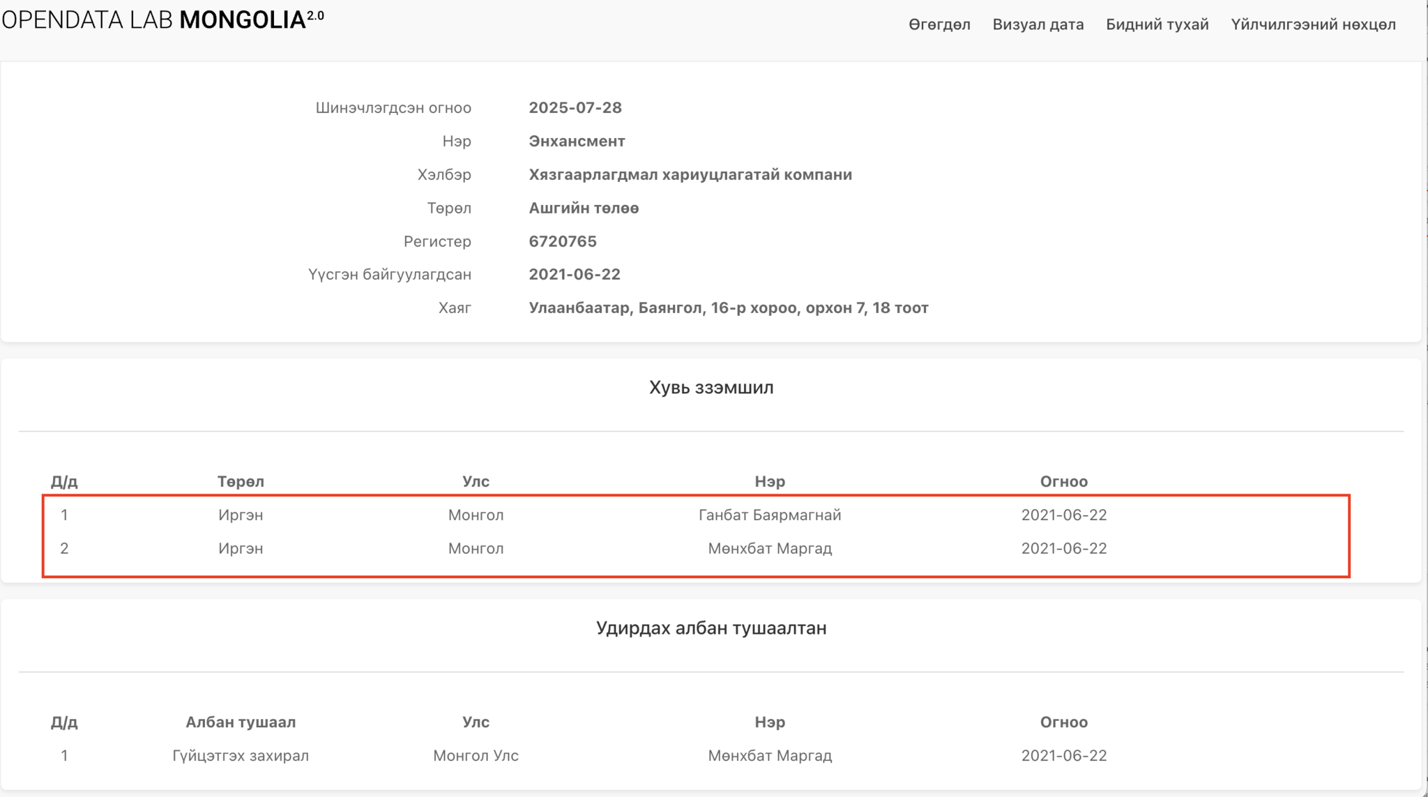 Улсын бүртгэлийн нээлттэй мэдээллийн сангаас тодруулахад, дээрх компаниудыг Мөнхбатын Маргад, Ганбатын Баярмагнай нар хамтран үүсгэн байгуулсан, гүйцэтгэх захиралаар ажиллаж байгаа нь анхаарал татаж байна.
