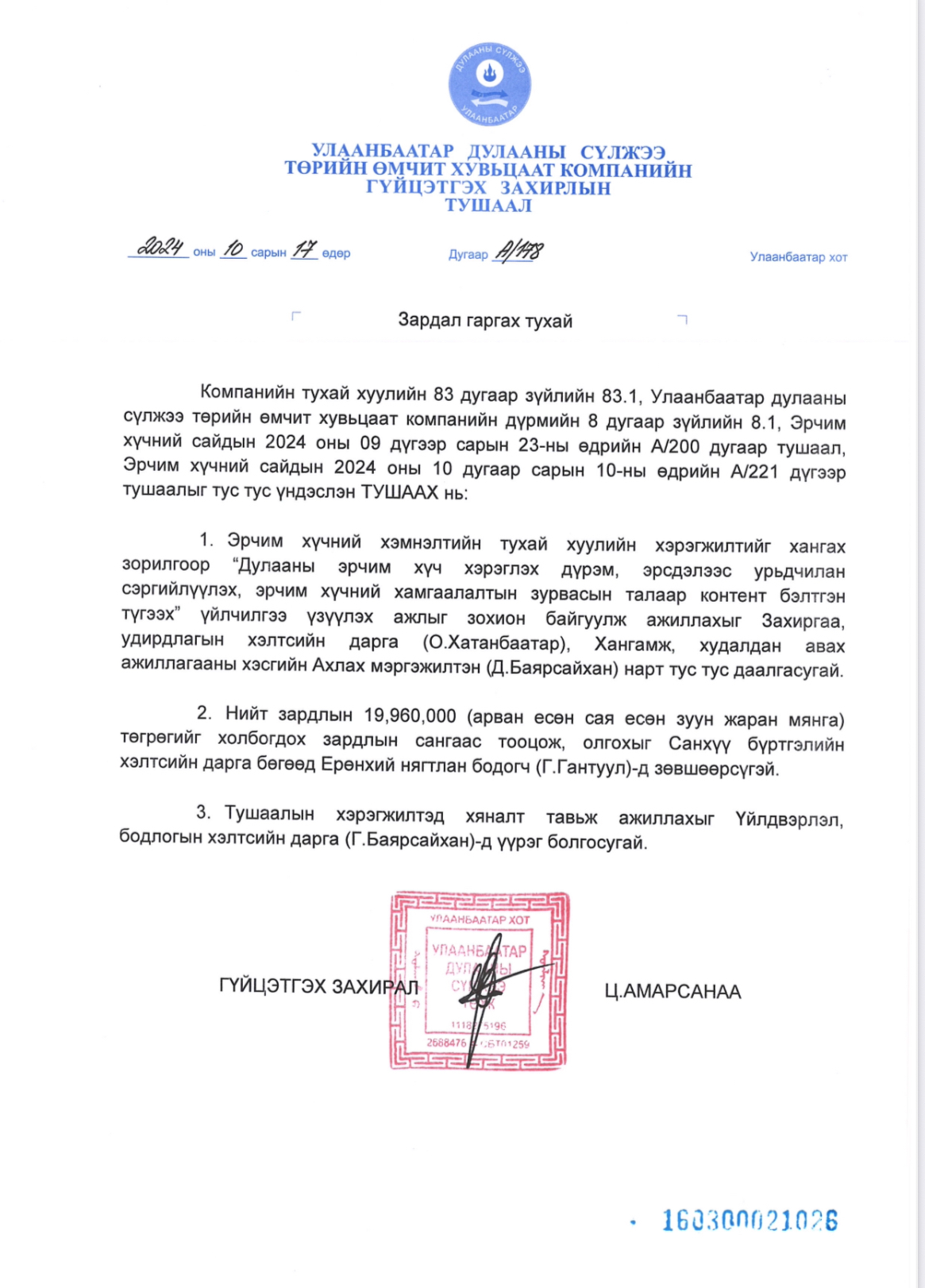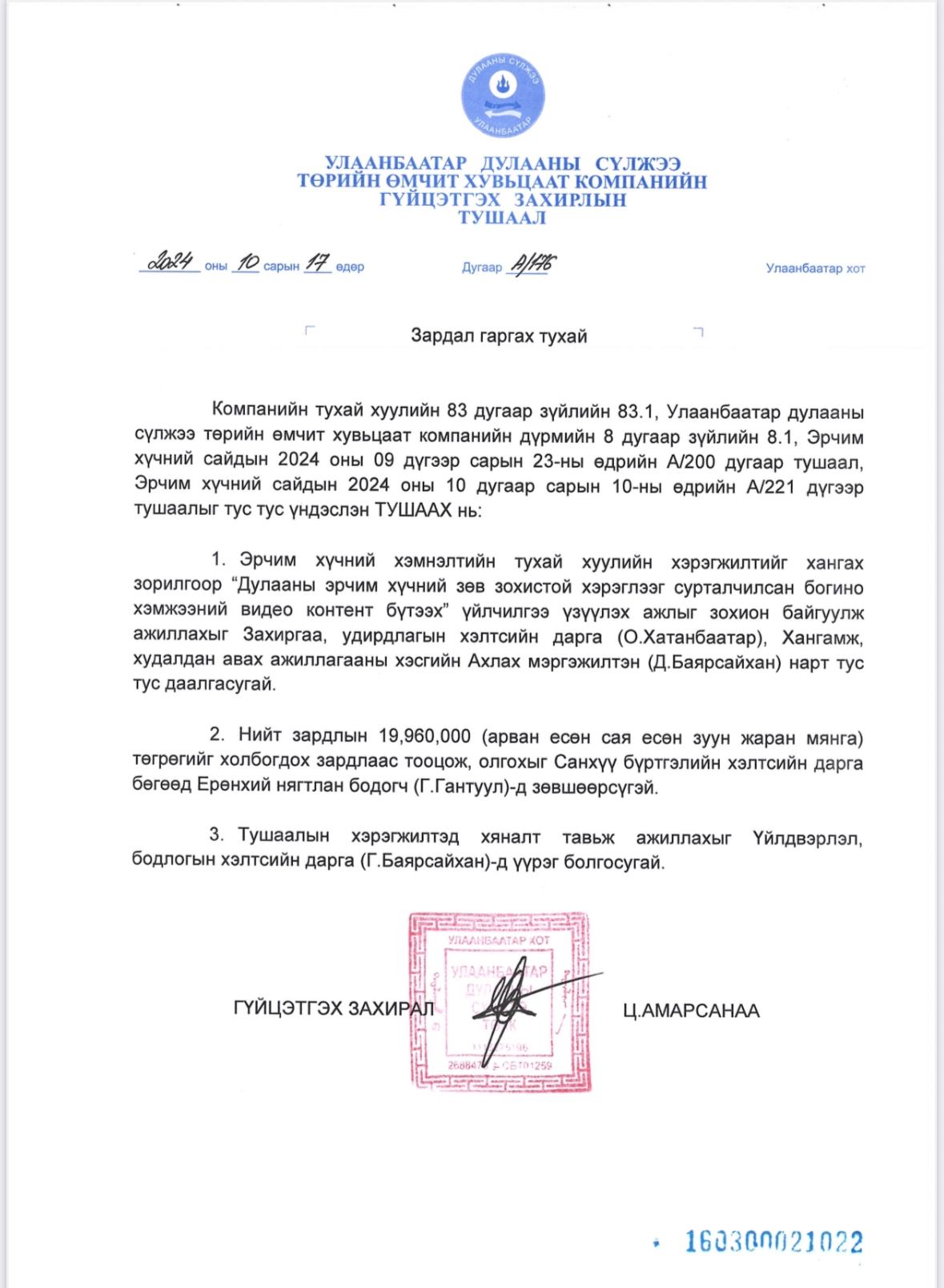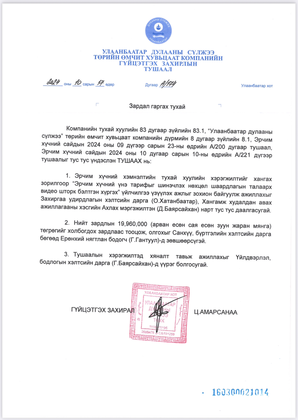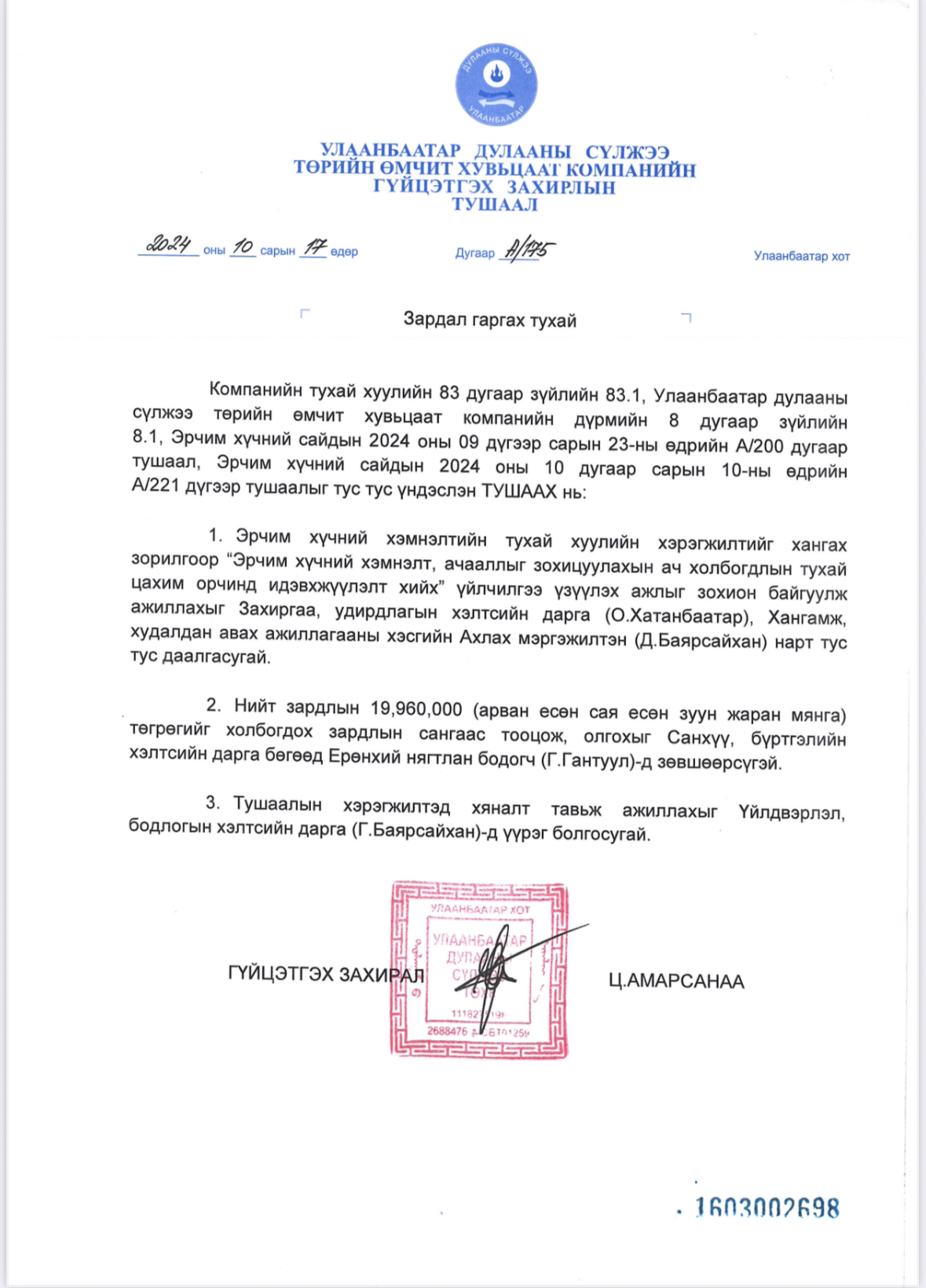 Харин тэрээр томилогдоод арав ч хоноогүй байхдаа буюу 2024 оны аравдугаар сарын 17-ны өдөр Эрчим хүчний сайд Б.Чойжилсүрэнгийн 2024 оны 09 дүгээр сарын 23-ны өдрийн А/200 дугаар тушаал, 2024 оны 10 дугаар сарын 10-ны өдрийн А/221 дугаар тушаалыг тус тус үндэслэн “Зардал гаргах тухай” А/174, А/175, А/176, А/177, А/178 зэрэг тушаалуудыг нэгэн зэрэг гаргасан байна.