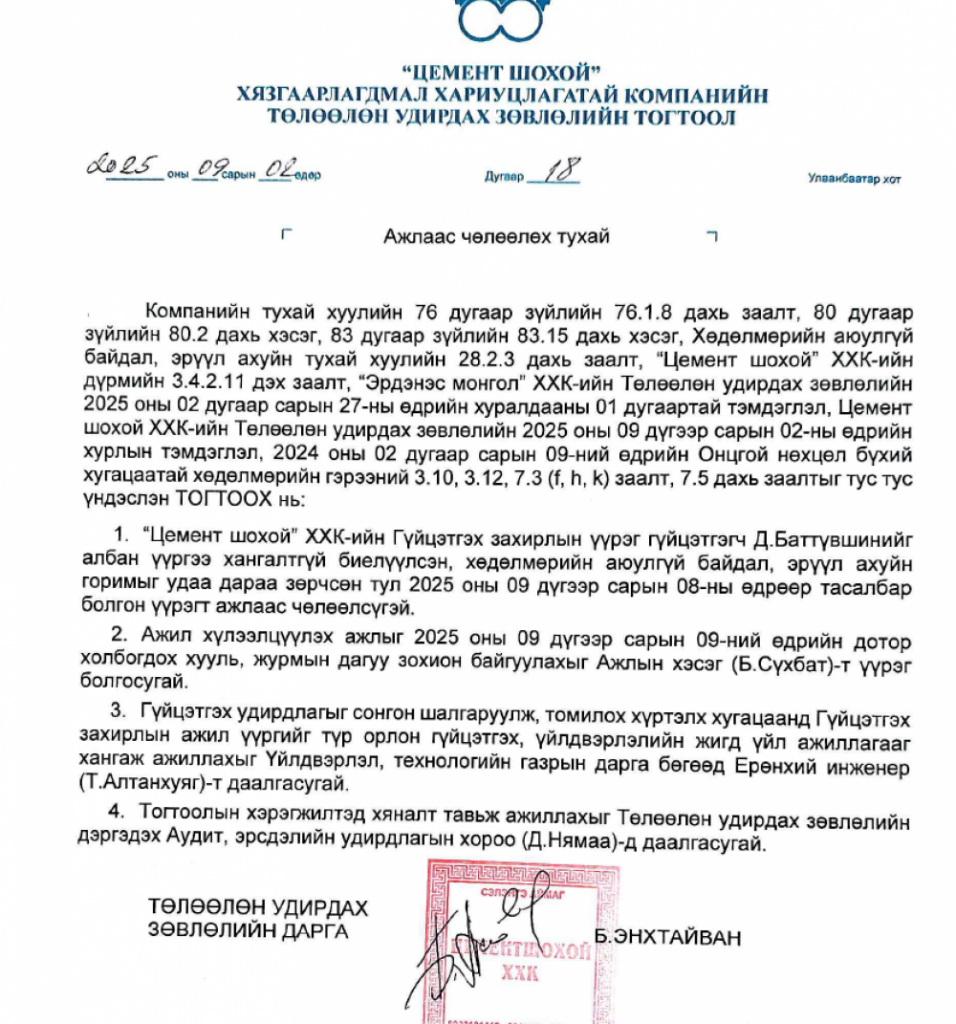 -Компанийн гүйцэтгэх удирдлага, менежментийн багийг шинэчлэх чиглэлээр үр дүнтэй арга хэмжээ авахыг Гүйцэтгэх захирал С.Наранцогтод даалгасан байна. Гэтэл энэ шийдвэр хэрэгжилгүй өдийг хүрчээ.