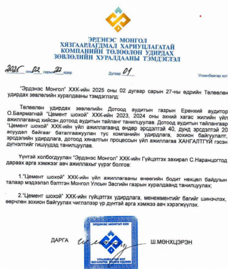 “Эрдэнэс Монгол” ХХК-ийн ТУЗ өнгөрсөн хоёрдугаар сард буюу одоогоос долоон сарын өмнө Хөтөлийн “Цемент шохой” ХХК-ийн ТУЗ тус компанийн 2023, 2024 оны дотоод аудитын тайланг хэлэлцээд “Хангалтгүй” гэж дүгнэн,