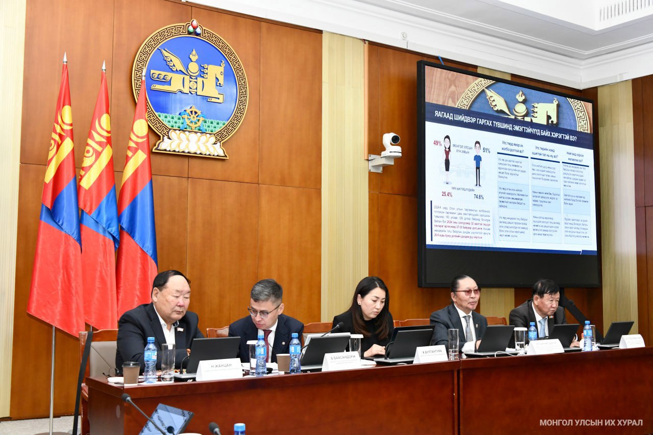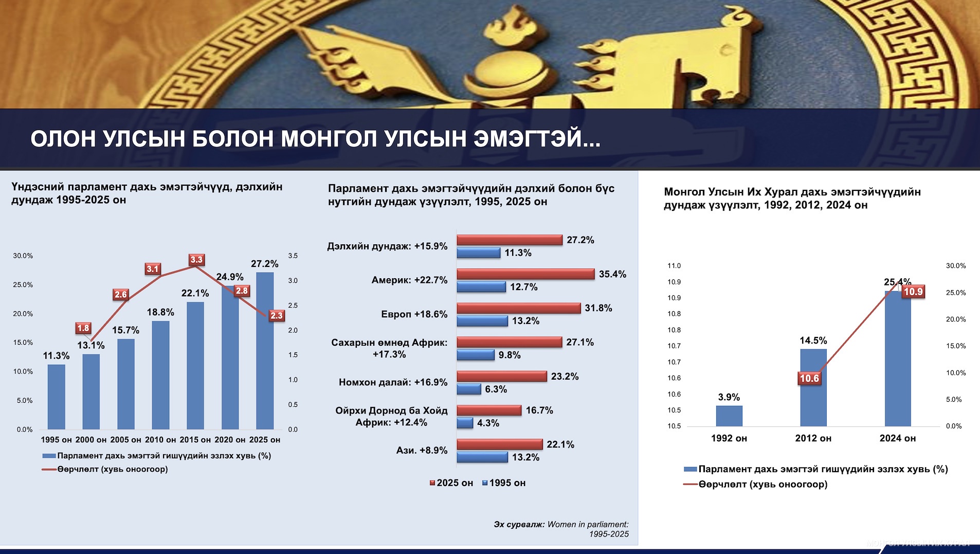 Монгол Улсын байнгын ажиллагаатай парламентад шийдвэр гаргах түвшинд эмэгтэйчүүдийг хэрхэн оролцуулж байсан талаар мэдээлэхдээ, Улсын Бага Хурлыг байгуулахад 50 гишүүний хоёр нь эмэгтэй байсан бол 1992 оны Улсын Их Хуралд гурав болж нэмэгдэж, энэ үзүүлэлт цаашид тогтвортой өсөж, 2024 оны парламентад 32 эмэгтэй гишүүнтэй болсон.