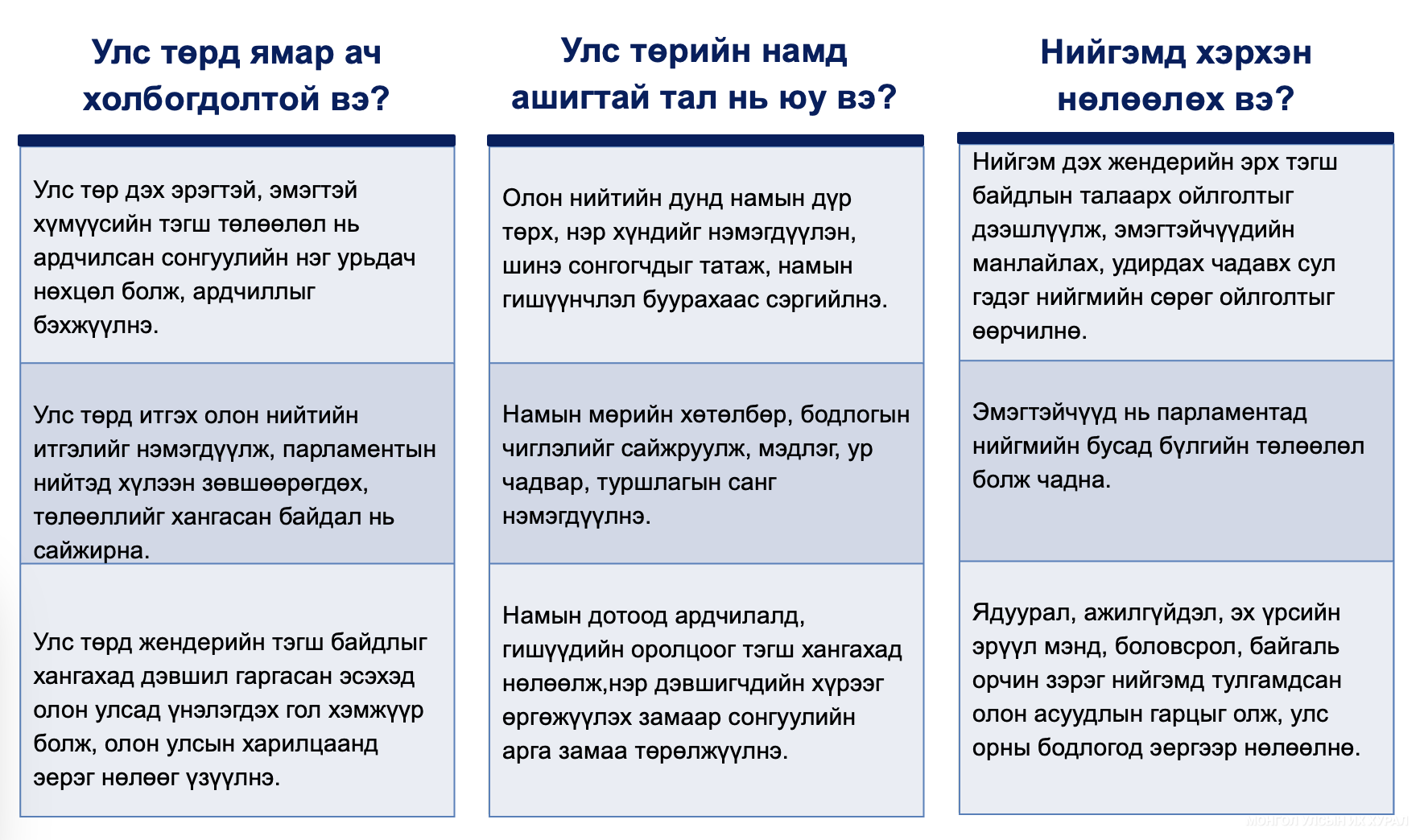 Түүнчлэн Монгол Улсын сонгуулийн тогтолцооны түүх, сонгуулийн тогтолцооны сонголт, Улсын Их Хурлын гишүүдийн тоо болон төлөөлөх чадвар, Улсын Их Хуралд сонгогдсон улс төрийн нам, гишүүдийн мэргэжил, хүйсийн төлөөллийн талаар дэлгэрэнгүй мэдээлэл хүргэлээ.