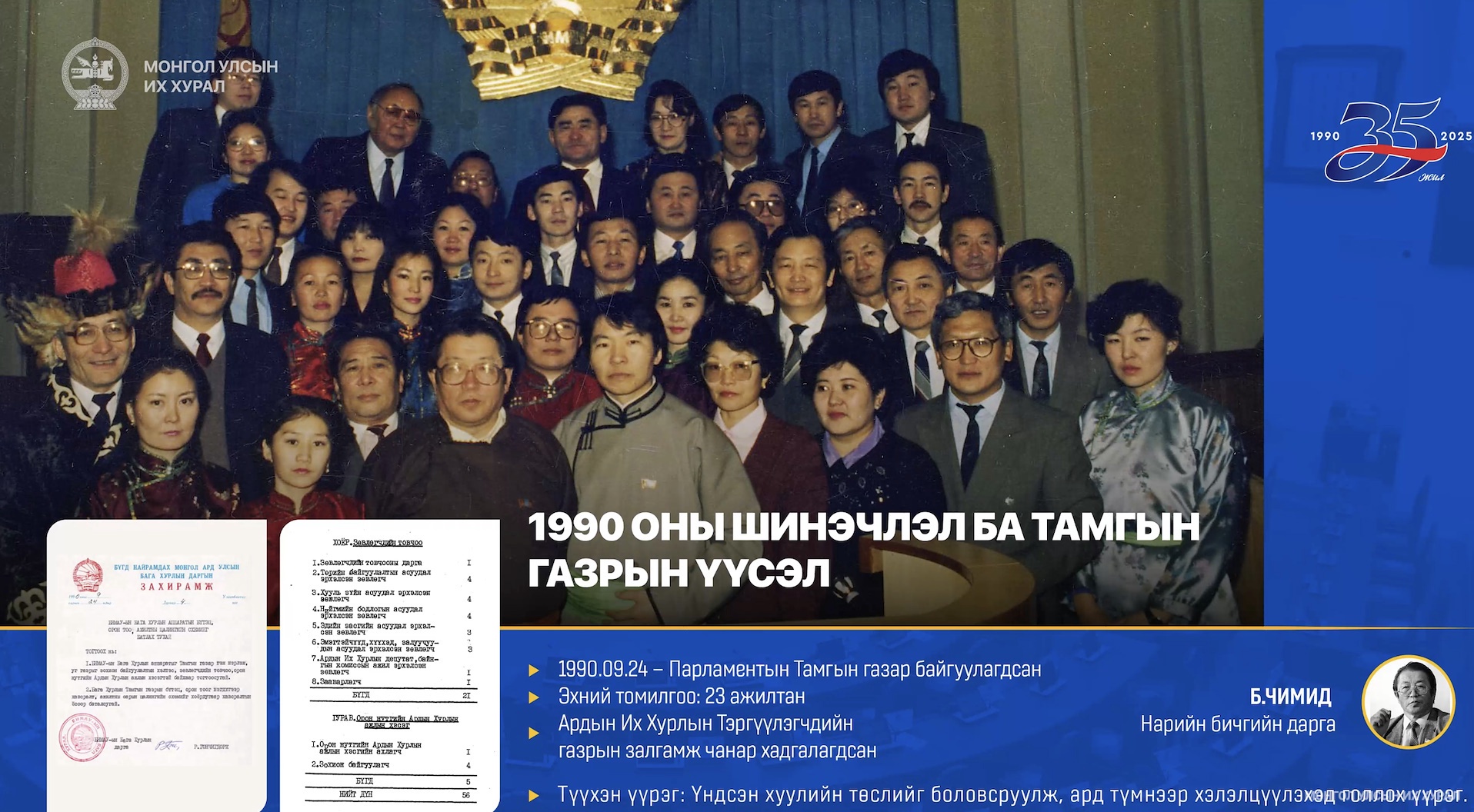 Тэрбээр, одоогоос 35 жилийн өмнө энэ өдрүүдэд 13-ны өдрийн чуулганы хуралдаандаа бэлтгээд Улсын Бага Хурлын гишүүд ямар тангараг өргөх вэ гэдгийг хэлэлцэж байсан бол өнөөдөр Байнгын ажиллагаатай парламентын ололт амжилт, сургамжийн талаар илтгэл тавихаар болж байгаадаа талархаж байна гэв.