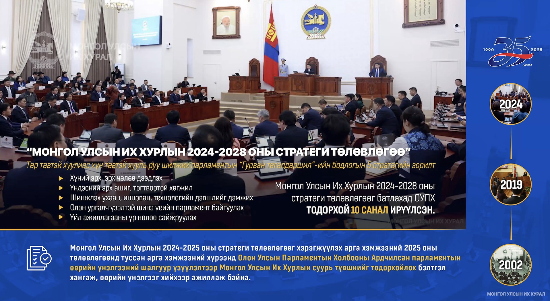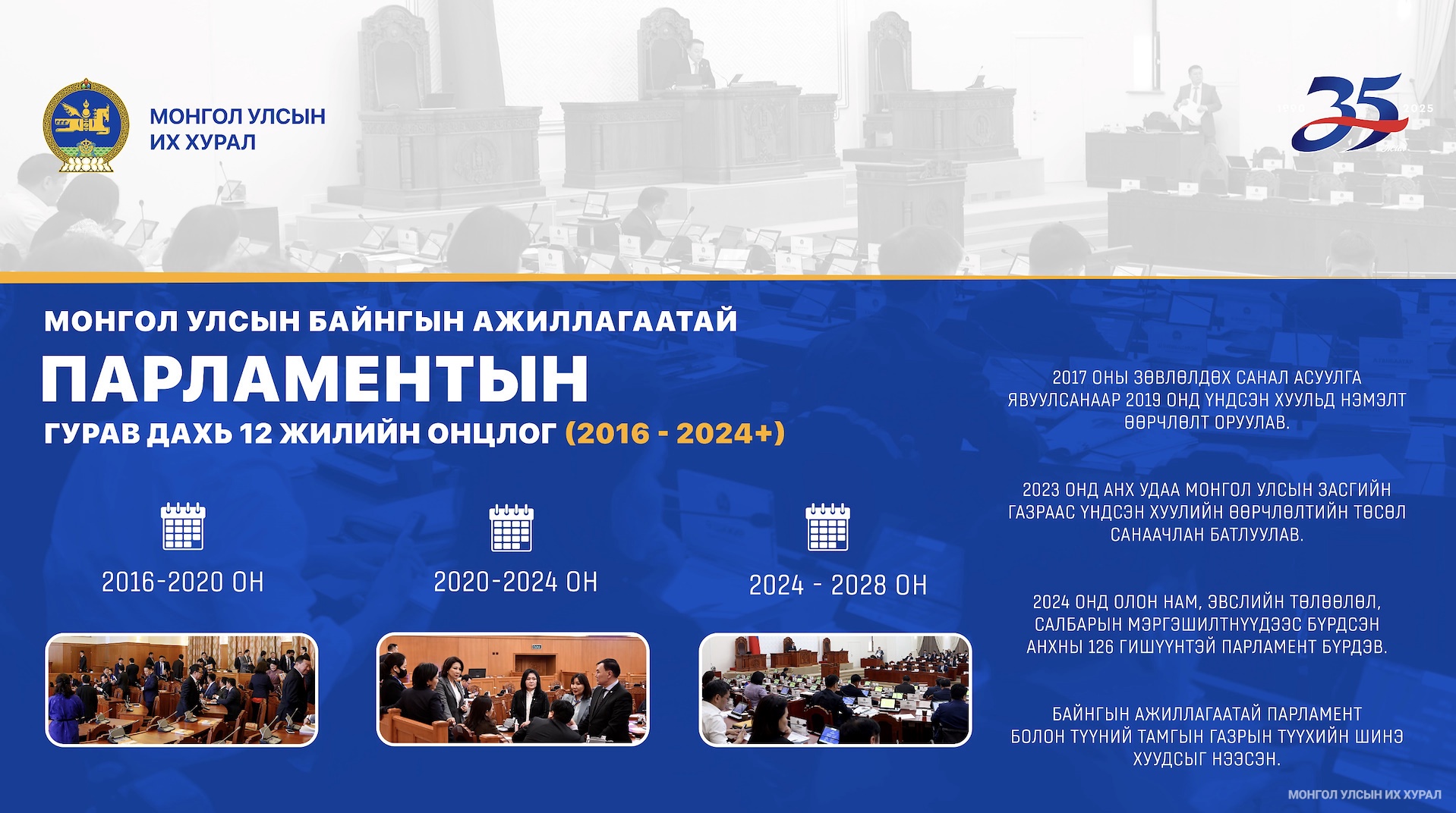 Түүнчлэн 2016 оноос эхлэн өнөөдөр бид Монгол Улсын байнгын ажиллагаатай парламентын түүхэн цаг хугацааны гурав дахь 12 жилийн мөчлөгийг туулж байгааг тэрбээр дурдаад, энэ үеийн онцлог нь Монгол Улсын шинэ ардчилсан Үндсэн хуулиар хуваарилсан төрийн эрх мэдэл хэрэгжүүлэгч төрийн тогтолцоог эрх зүйт төрийн мөн чанарт нийцүүлэх, хууль тогтоомжийг үндсэн зорилгод нь хүргэж, нийгэм дэх асуудал, бэрхшээлийг бодитоор арилгаж, амьдралын чанарыг сайжруулахад чиглэсэн их эрэл хайгуулын жилүүдийг туулж байна хэмээн тодорхойлов.