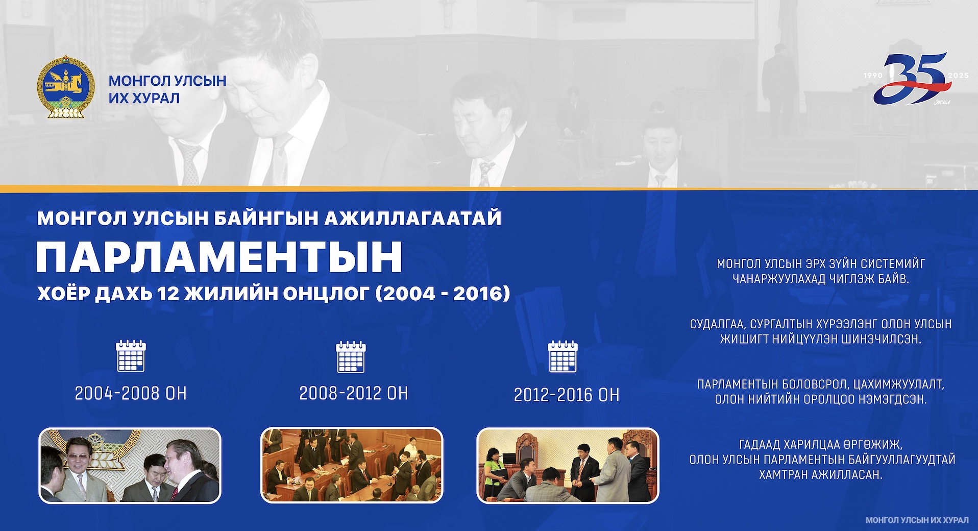 Монгол Улсын байнгын ажиллагаатай парламентын хоёр дахь 12 жилийн онцлогийн тухайд Улсын Их Хурлын 2004-2016 оны хугацаанд хамаарах парламентууд нь Монгол Улсын эрх зүйн системийг чанаржуулахад чиглэж байсан гэж байлаа.