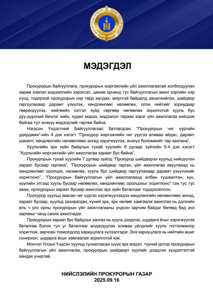 “Прокурорын байгууллага, прокурорын мэргэжлийн үйл ажиллагаатай холбогдуулан зарим хэвлэл мэдээллийн хэрэгсэл, цахим орчинд тус байгууллагын ажил хэргийн нэр хүнд, тодорхой прокурорын нэр төрд халдах, аюулгүй байдалд заналхийлэх, шийдвэр гаргуулахаар дарамт үзүүлэх, хөндлөнгөөс нөлөөлөх, олон нийтийг зориудаар төөрөгдүүлэх, нийгмийн сэтгэл зүйд сөргөөр нөлөөлөх зорилготой хууль бус дуудлага, бичлэг хийх, худал мэдээ, мэдээлэл тараах зэрэг үйл ажиллагаа хийгдэж байгаа тул энэхүү мэдэгдлийг гаргаж байна.