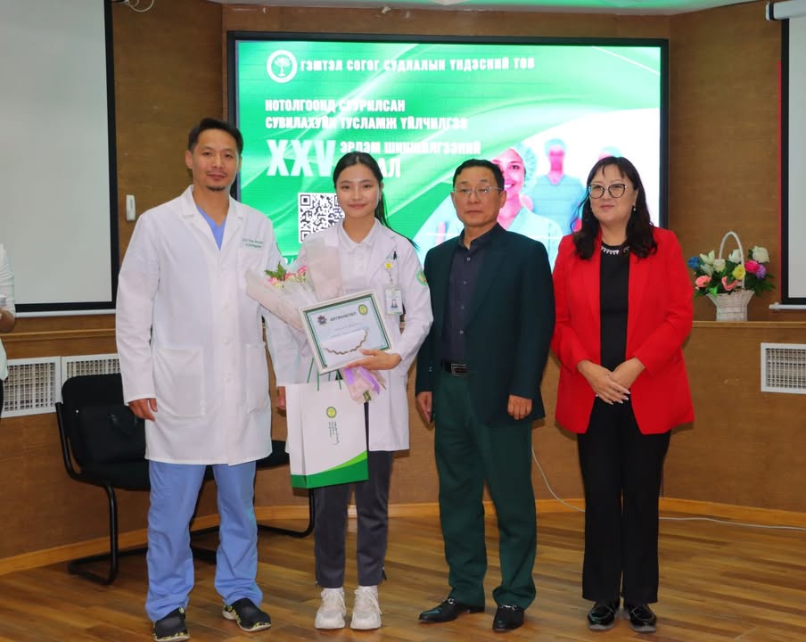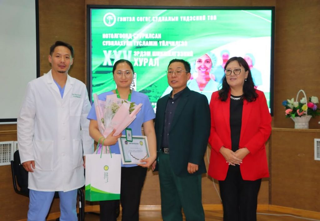 ТУСГАЙ БАЙР: “Тохойн үений хугарлын дараах эрт үеийн хөдөлгөөн засал эмчилгээний үр дүнг судлах нь” сэдвээр Сэргээн засах эмчилгээний тасгийн ахлах хөдөлгөөн засалч Х.Цэдэн-Иш (800.000 төгрөг, гарын бэлэг) нар шалгарч, шагналаа гардаж авлаа.