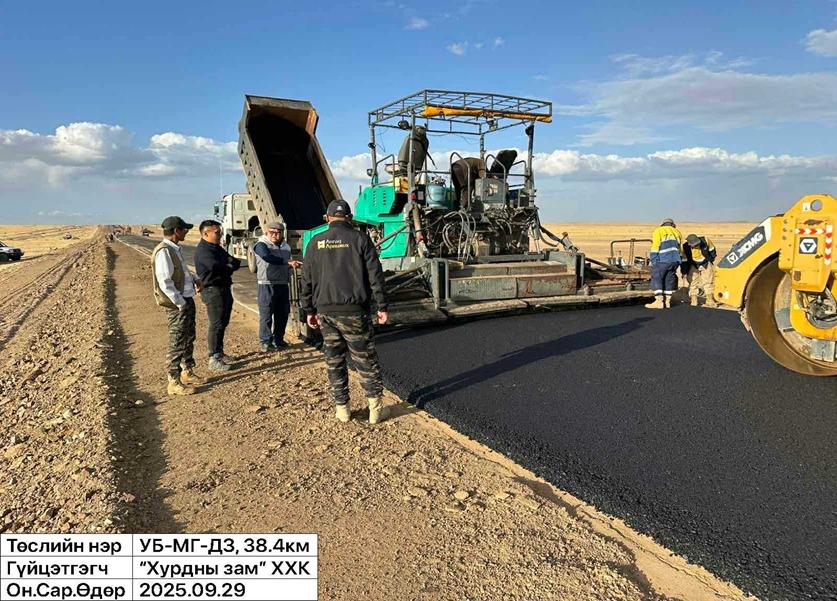 3. “Хурдны зам” ХХК-ийн гүйцэтгэж буй Мандалговь-Даланзадгад чиглэлийн 89-103 дэх 14 км авто замын 94-103 дэх 9 км авто замын суурь болон өнгөн асфальт цутгаж цагаан зураас, далан хөвөөний ажил хийгдэж байгаа бол үлдсэн 5 км авто замын газар шороо, хиймэл байгууламжийн ажил бүрэн дуусч асфальт цутгахад бэлэн болоод байна.