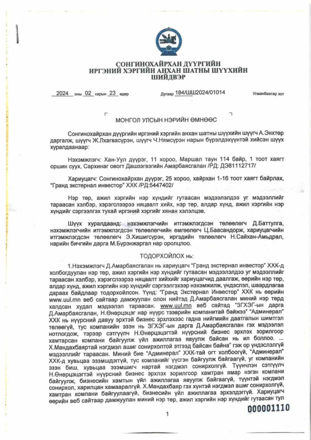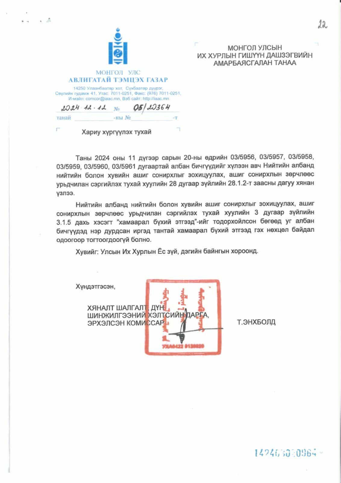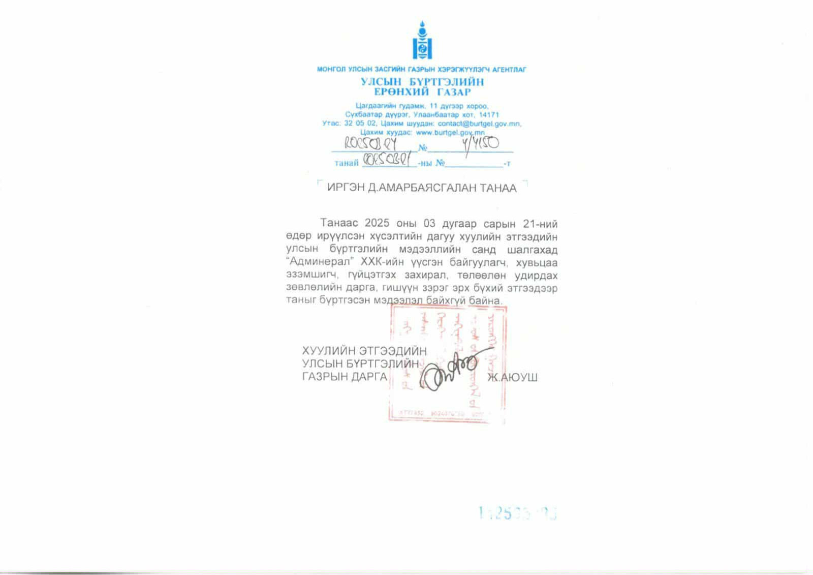 УИХ-ын дарга Д.Амарбаясгалан Улсын бүртгэлийн ерөнхий газраас 2023, 2025 онд удаа дараалан лавлагаа авчээ. Уг тодорхойлолтод “Админерал” ХХК-ийн үүсгэн байгуулагч, хувьцаа эзэмшигч, эцсийн өмчлөгч болон гүйцэтгэх удирдлагаар таны нэр бүртгэгдээгүй байна” гэжээ.