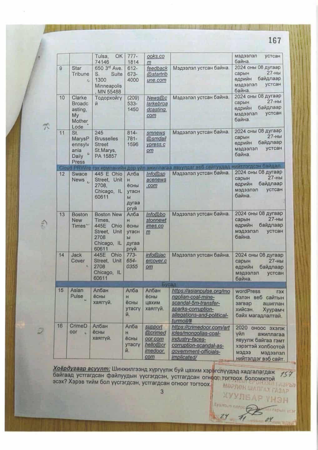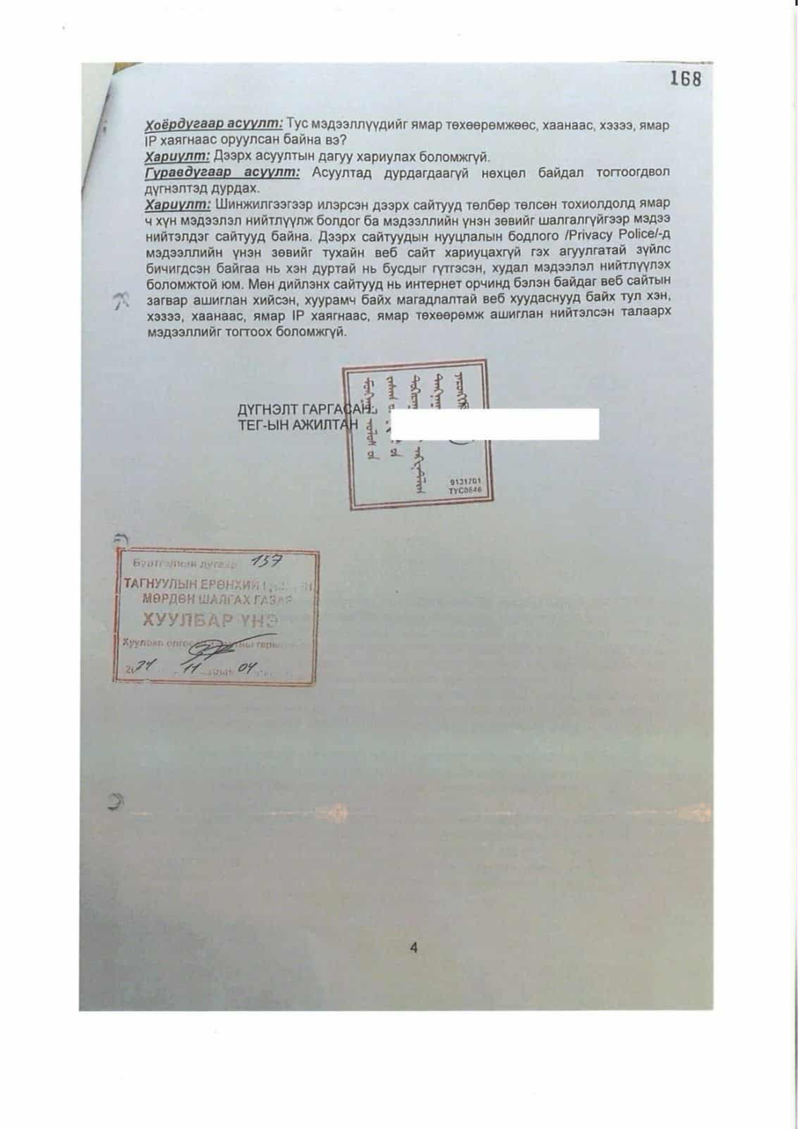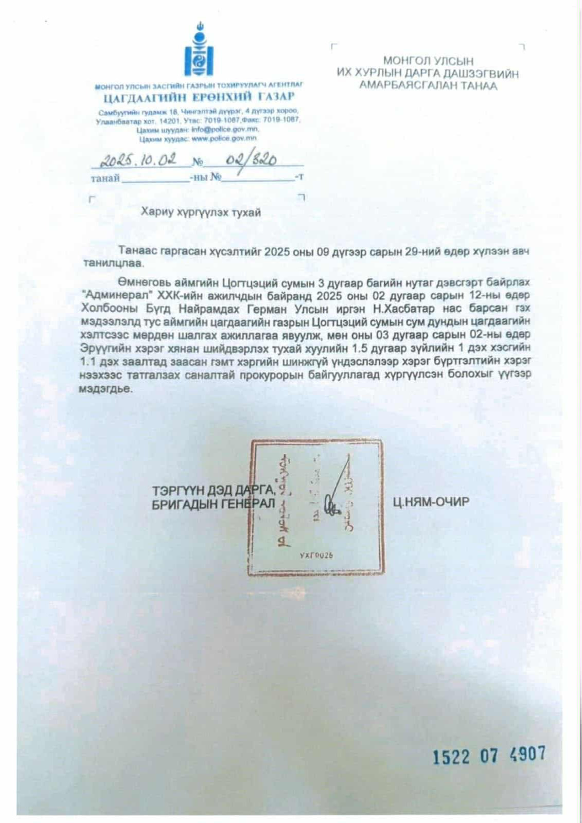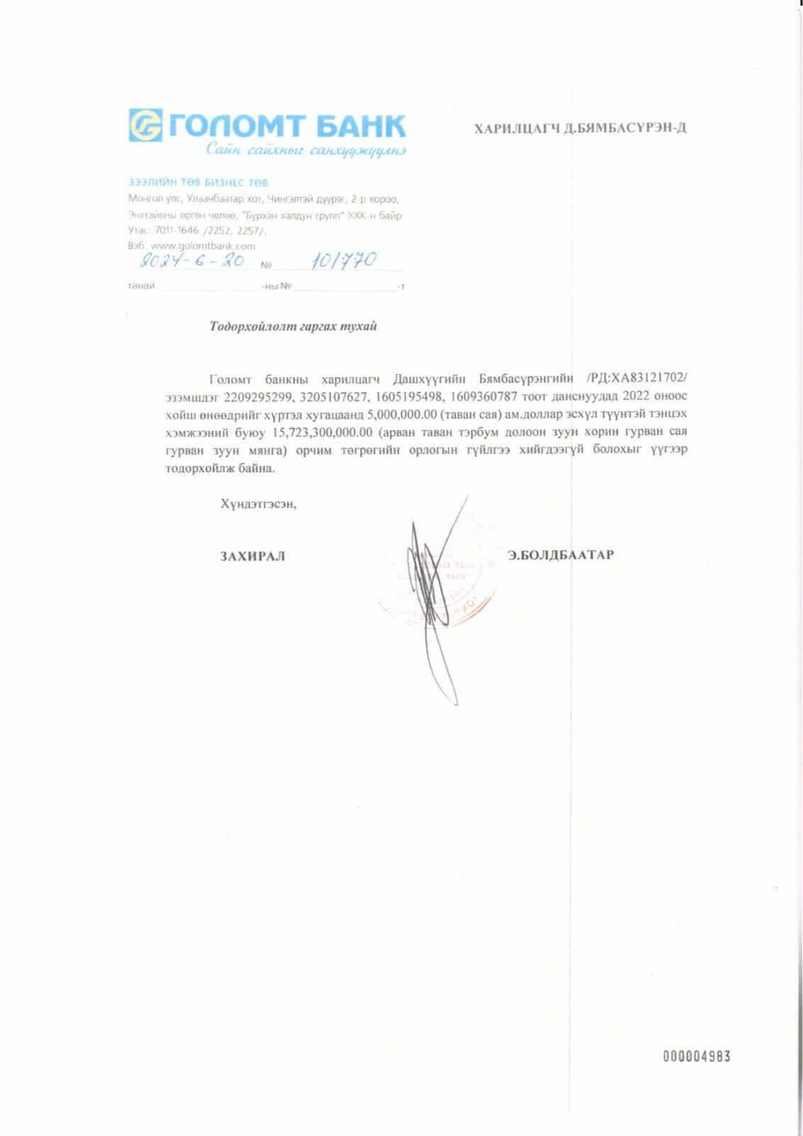 УИХ-ын дарга Д.Амарбаясгалан Улсын бүртгэлийн ерөнхий газраас 2023, 2025 онд удаа дараалан лавлагаа авчээ. Уг тодорхойлолтод “Админерал” ХХК-ийн үүсгэн байгуулагч, хувьцаа эзэмшигч, эцсийн өмчлөгч болон гүйцэтгэх удирдлагаар таны нэр бүртгэгдээгүй байна” гэжээ.