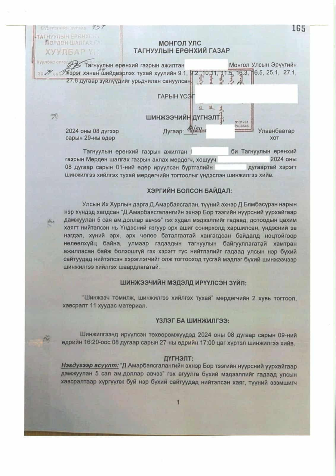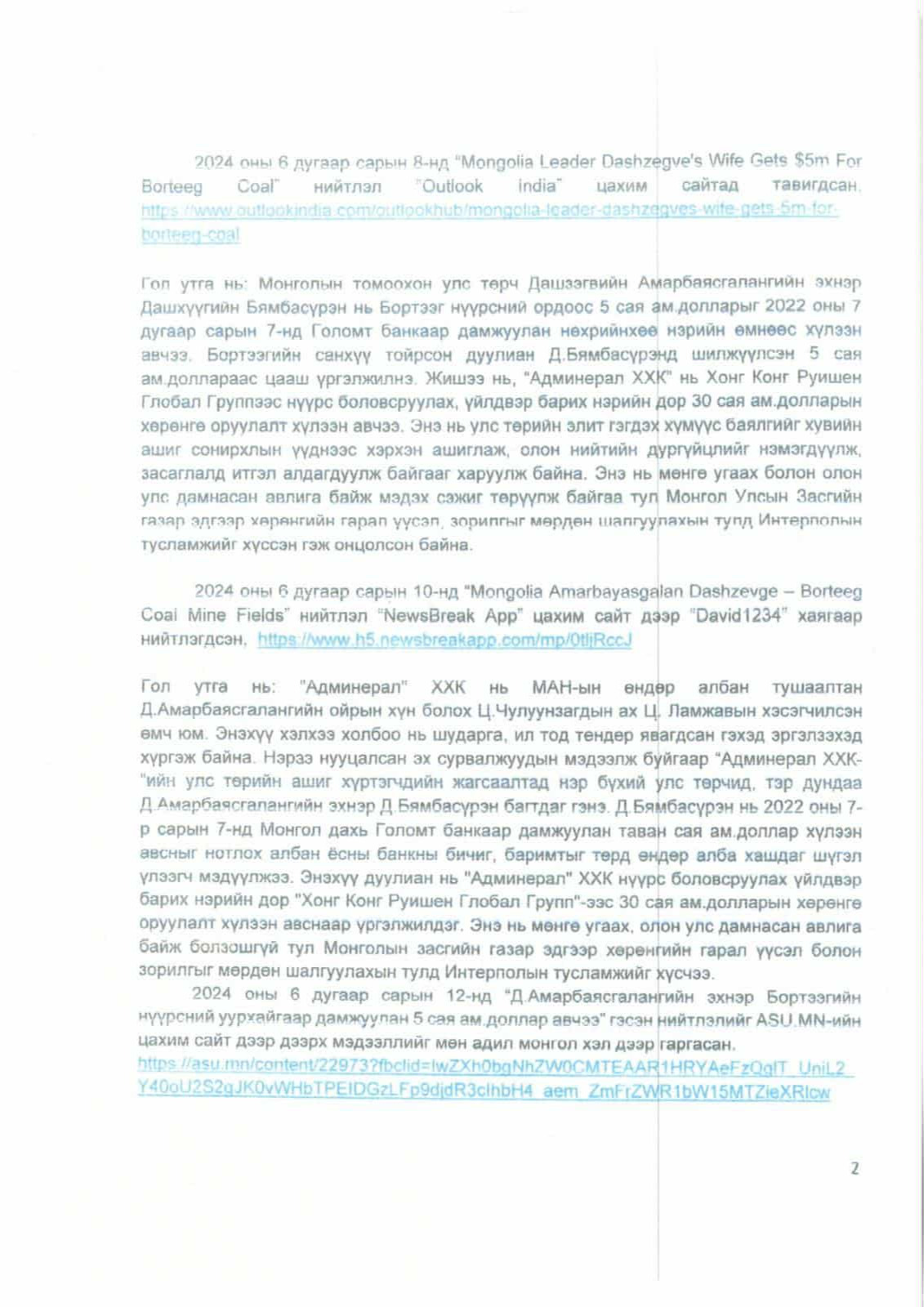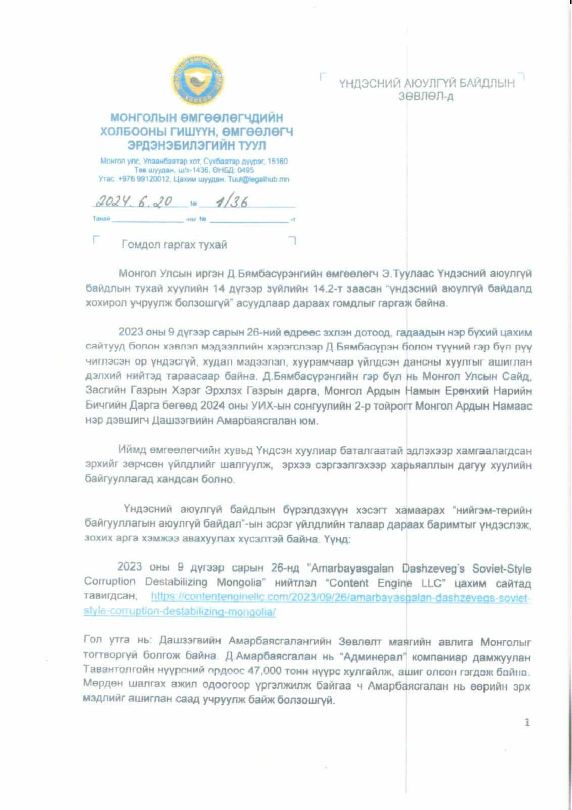 Энэ гомдолд “2023 оны есдүгээр сарын 26-нд Amarbayasgalan Dashzeveg’s Soviet-Style Corruption Destabilizing Mongolia нийтлэл“ Content Engine LLC”-ийн нэр дээр гарсан байдаг. “Д.Амарбаясгалан нь“Админерал” компаниар дамжуулан Тавантолгойн нүүрсний ордоос 47000 тонн нүүрс хулгайлсан” гэсэн агуулгатай нийтлэл гарсан. Мөн 2024 оны зургадугаар сарын 8-нд “Mongolia Leader Dashzeveg’s Wife Gets $5M for Borteeg Coal” нийтлэл гарсан. Ямар ч үндэслэлгүй нийтлэл гарч, Монгол Улсын томоохон банкны хуулгыг хуурамчаар үйлдэж, их хэмжээний хээл хахуулийн хэрэгт холбогдуулан гүтгэж байна. Энэ үйлдэл нийгэм, төрийн аюулгүй байдлын эсрэг үйлдсэн гэмт хэрэг гэж үзэх үндэстэй байна” гэсэн хүсэлтийг Үндэсний аюулгүй байдлын зөвлөлд гаргажээ. 2024 оны зургадугаар сарын 24 -нд Үндэсний аюулгүй байдлын зөвлөлийн дарга, хошууч генерал Д.Ариунболд энэхүү гомдлыг хүлээж авч, Тагнуулын Ерөнхий газар руу шилжүүлжээ. Тагнуулын Ерөнхий газар 2024 оны наймдугаар сарын 29-ний өдөр 12/24 тоот шинжээчийн дүгнэлт гаргасан байна. Тагнуулын Ерөнхий газрын шинжээчийн дүгнэлтэд “Д.Амарбаясгалангийн эхнэр Бор тээгийн нүүрсний уурхайгаар дамжуулан 5 сая ам.доллар авчээ” гэх агуулга бүхий мэдээллийг гадаад улсын нэр бүхий сайтуудаар дамжуулан нийтэлсэн. Мэдээлэл нийт 16 сайтад гарсан бөгөөд устгасан байна.