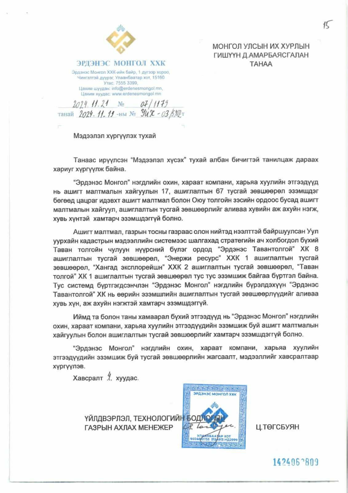 Б.Энхбаяр ч, Г.Занданшатар ч тэр Бор тээгийн уурхайг Д.Амарбаясгалан авсан хэмээн мэдэгдэж байсан. Гэтэл “Эрдэнэс Монгол” ХХК-аас 2024 оны 11 дүгээр сарын 19-нд Монгол Улсын Их Хурлын гишүүн Д.Амарбаясгаланд мэдээлэл хүргүүлжээ. “Эрдэнэс Монгол” ХХК нь ашигт малтмалын хайгуулын 17, ашиглалтын 67 тусгай зөвшөөрөл эзэмшдэг. “Эрдэнэс Монгол” ХХК- ийн нэгдлийн бүрэлдэхүүнд багтдаг “Эрдэнэс Тавантолгой” ХХК нь өөрийн эзэмшлийн ашиглалтын тусгай зөвшөөрлүүдийг аливаа хүн, аж ахуйн нэгжтэй хамтран эзэмшдэггүй” гэсэн мэдээллийг хүргүүлжээ.