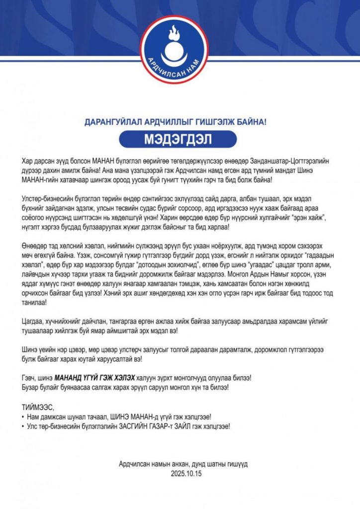 Өнөөдөр тэд хөлсний хэвлэл, нийгмийн сүлжээнд эрүүл бус ухаан ноёрхуулж, ард түмэнд хором сэхээрэх мөч өгөхгүй байна. Үзэж, сонсомгүй гүжир гүтгэлгээр бүгдийг дорд үзэж, өгснийг л нийтэлж орхидог “гадаадын хэвлэл”, өдөр бүр хар мэдээгээр булдаг “дотоодын зохиолчид”, өглөө бүр шинэ “угаадас” цацдаг тролл арми, лайвчдын хүчээр тархи угааж та биднийг доромжилж байгааг мэдэрлээ. Монгол Ардын Намыг хорсон, үзэн яддаг хүмүүс гэнэт өнөөдөр халуун янагаар хамгаалан тэмцэж, хань хамсаатан болон нэгэн хөнжилд орчихсон байгааг бид үзлээ! Хэний эрх ашиг хөндөгдөхөд хэн хэн огло үсрэн гарч ирж байгааг бид тодоос тод танилаа!