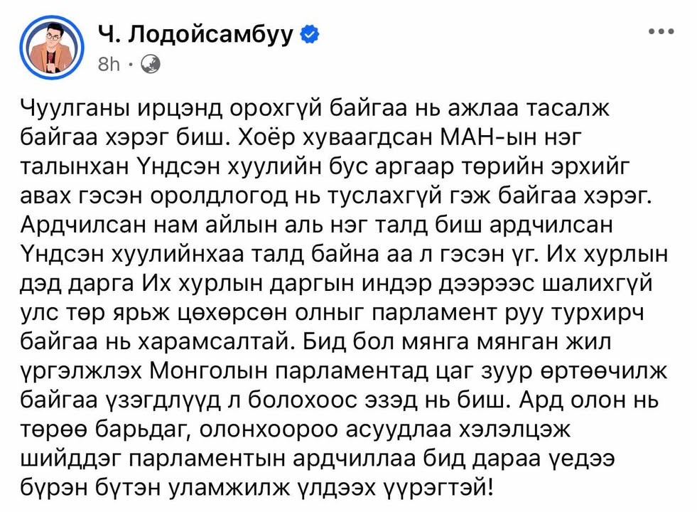 Энэ талаар УИХ-ын гишүүн Ч.Лодойсамбуу ийн байр сууриа илэрхийллээ.