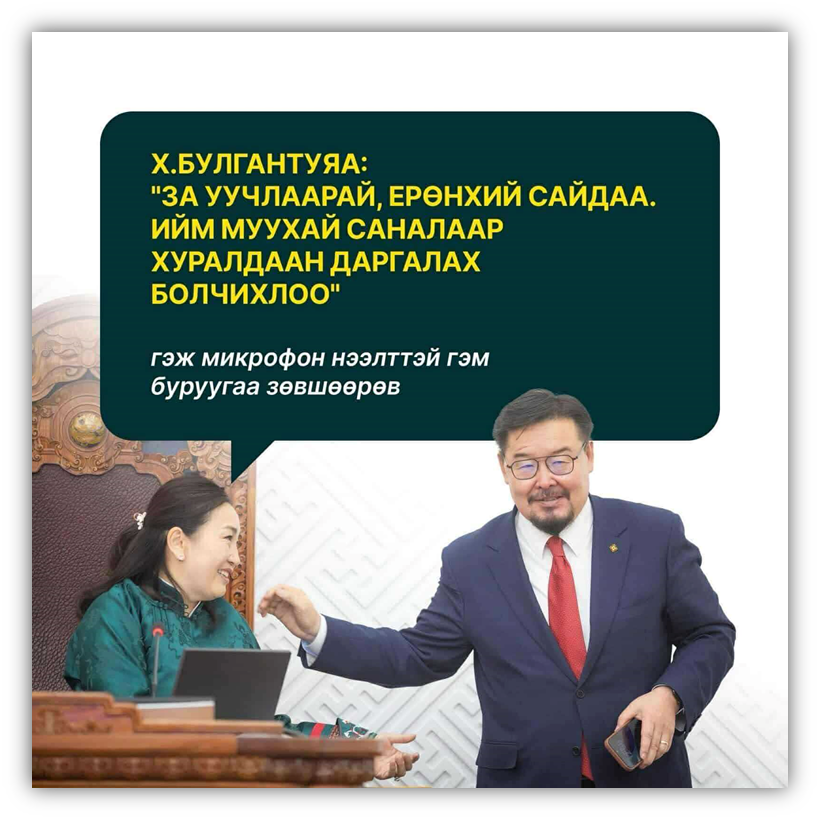 Х.Булгантуяа ийм муухай саналаар чуулган явуулсандаа Г.Занданшатараас уучлал эрсэн, Ц.Сандаг-Очир өөрөө өөртэйгөө маргалдсан нь төрийн эргэлт хийсэн гэм буруугаас чөлөөлөхгүй. Эрүүгийн хуулийн 19.2 дугаар зүйл.Төрийн эрх мэдлийг хууль бусаар авах, саатуулах Төрийн эрх барих дээд байгууллагын эрх мэдлийг хууль бусаар авах, хадгалах зорилгоор үгсэн тохирч хүчирхийллийн аргаар авахад бэлтгэсэн, зохион байгуулсан, оролцсон, санхүүгийн дэмжлэг үзүүлсэн; төрийн эрх барих дээд байгууллагын эрх мэдлийг хэрэгжүүлэх үйл ажиллагаанд хүч хэрэглэн саад учруулсан бол арван хоёр жилээс хорин жил хүртэл хугацаагаар хорих ял шийтгэнэ.