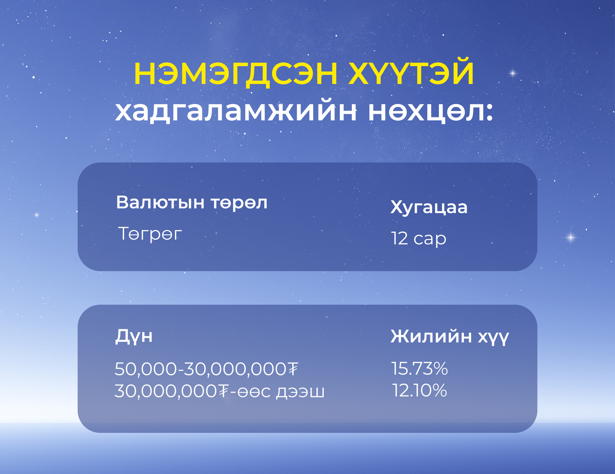 Иймд хэрэв та хуримтлалтай болохоор төлөвлөж байгаа бол 2025.10.30-наас өмнө амжиж Голомт банкны дурын салбарт хандан эсвэл Интернэт банк, Smart bank аппликэйшнийг ашиглан онлайнаар шинэ хадгаламж нээгээд Голомт банкнаас санал болгож буй өндөр хүүгийн өгөөжийг алдалгүй хүртээрэй. Ингэхдээ “Хадгаламжтай аялал-30 жил” гэсэн хадгаламжийг сонгон нээлгэх бөгөөд энэхүү хадгаламжийн бүтээгдэхүүн нь 12 сарын хугацаатай, төгрөгийн хадгаламж байна.