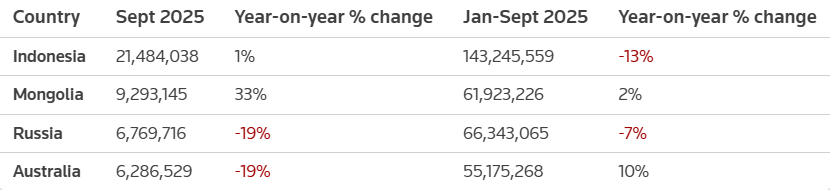 БНХАУ өнгөрсөн сард Монгол Улсаас 9.29 сая тонн нүүрс импортолсон нь энэ төрлийн дата цуглуулж эхэлсэн 2015 оноос хойших хамгийн дээд үзүүлэлт болжээ. Хамгийн гол нь, БНХАУ гаднаас авах нүүрснийхээ хэмжээг багасгаж, 2025 оны эхний есөн сарын байдлаар 11 хувиар бууруулсан байхад Монголоос хийх импорт эсрэгээрээ түүхэн дээд хэмжээнд хүртэл өссөн нь Хятадын Засгийн газар Монголтой зорилтот маягаар ажиллаж эхэлснийг харуулж байна, цаашлаад Монгол Улс БНХАУ-ын хамгийн том нийлүүлэгч болох тийшээ хандаж байна гэж эх сурвалжид бичсэн байна.