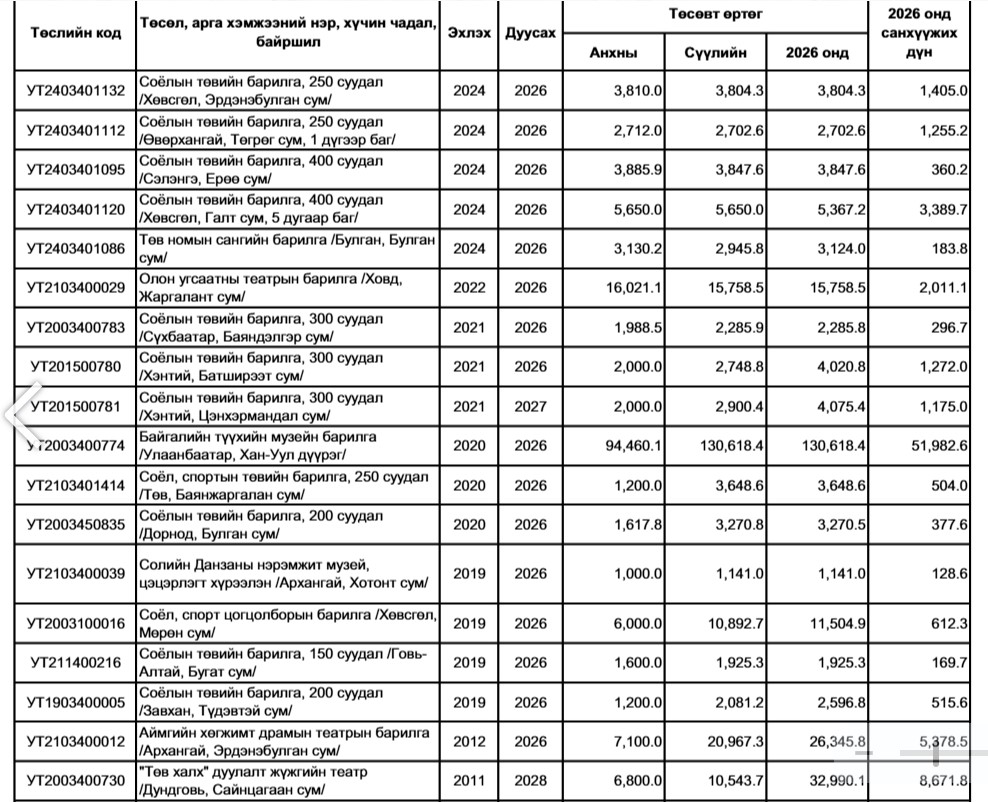 Дундговь аймгийн Сайнцагаан суманд “Төв халх” дуулалт жүжгийн театр баригдах эхлэлийг 2011 онд тавьжээ. Тус барилгын анхны төсөвт өртөг 6.8 тэрбум төгрөг байсан бол 14 жил дамнасан уг барилгын төсөвт өртөг 2026 онд 32.9 тэрбум төгрөгт хүрч, ирэх 2026 онд 8.6 тэрбум төгрөгийн санхүүжилт олгохоор байна. Мөн 2012 онд Архангай аймгийн Эрдэнэбулган суманд Аймгийн хөгжимт драмын театрын барилга барих ажил эхэлжээ. Тус барилгын анхны төсөвт өртөг 7.1 тэрбумаас 26 тэрбум болж өсчээ. Энэ онд 5.3 тэрбум төгрөгийн санхүүжилт авахаар улсын төсөвт суужээ.