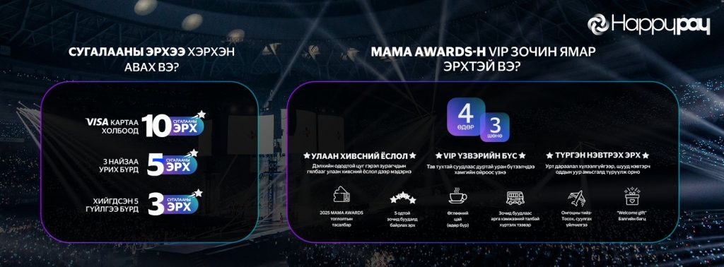 Тэд HappyPay цахим хэтэвчийг идэвхтэй ашигладаг харилцагчид дундаасаа ЕСӨН харилцагч шалгаруулж, MAMA AWARDS-д VIP зочноор аялуулах гэж байгаа юм. Түүнчлэн энэхүү урамшуулалт хөтөлбөрөө тохиолдуулан CU-д ‘50% CASHBACK’ буцаан олголтын аян зарлаад байна.