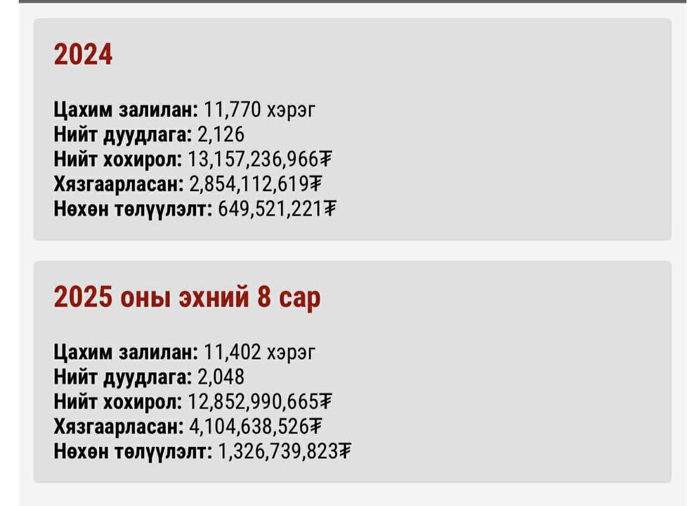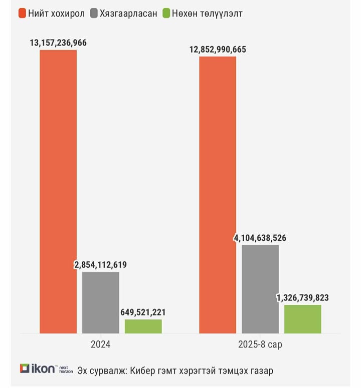 Харин өнгөрсөн онд цахим залилангаас үүдэн иргэдэд 13.1 тэрбум төгрөгийн хохирол учирсан бөгөөд 649 сая төгрөгийн хохирлыг нөхөн төлүүлсэн дүн мэдээ байна.