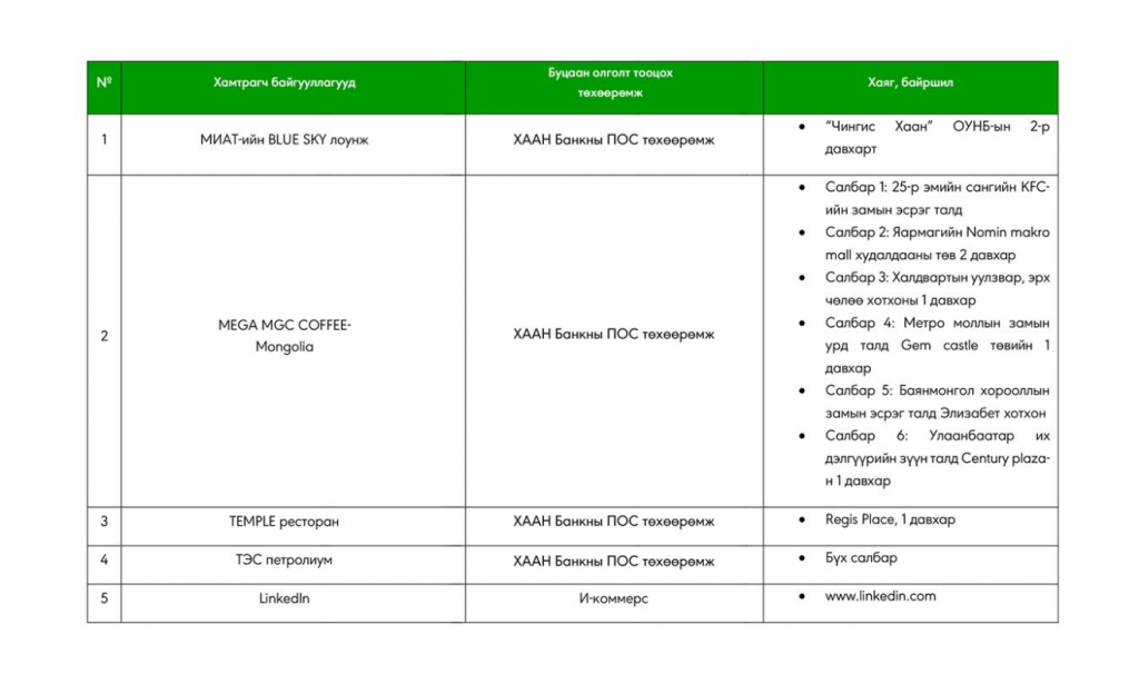 Виза бизнес дебит картыг шинээр захиалан авсан харилцагчдадаа зориулан бид 2025 оны 11-р сарын 10-ны өдрөөс 12-р сарын 31-ний өдрийг дуусталх хугацаанд сонгогдсон дараах нэр бүхий худалдаа үйлчилгээний байгууллагуудын ПОС төхөөрөмжид картаа уншуулан худалдан авалт тутмынхаа 10%-ийг буцаан олголт хэлбэрээр авах урамшуулалт аяныг зарлалаа. Жишээ нь, та дээрх хугацаанд аль нэг сонгогдсон байгууллагын ПОС төхөөрөмжид Виза бизнес дебит картаа уншуулан 300,000 төгрөгийн гүйлгээ хийсэн тохиолдолд таны данс руу 30,000 төгрөгийн буцаан олголт орох юм.