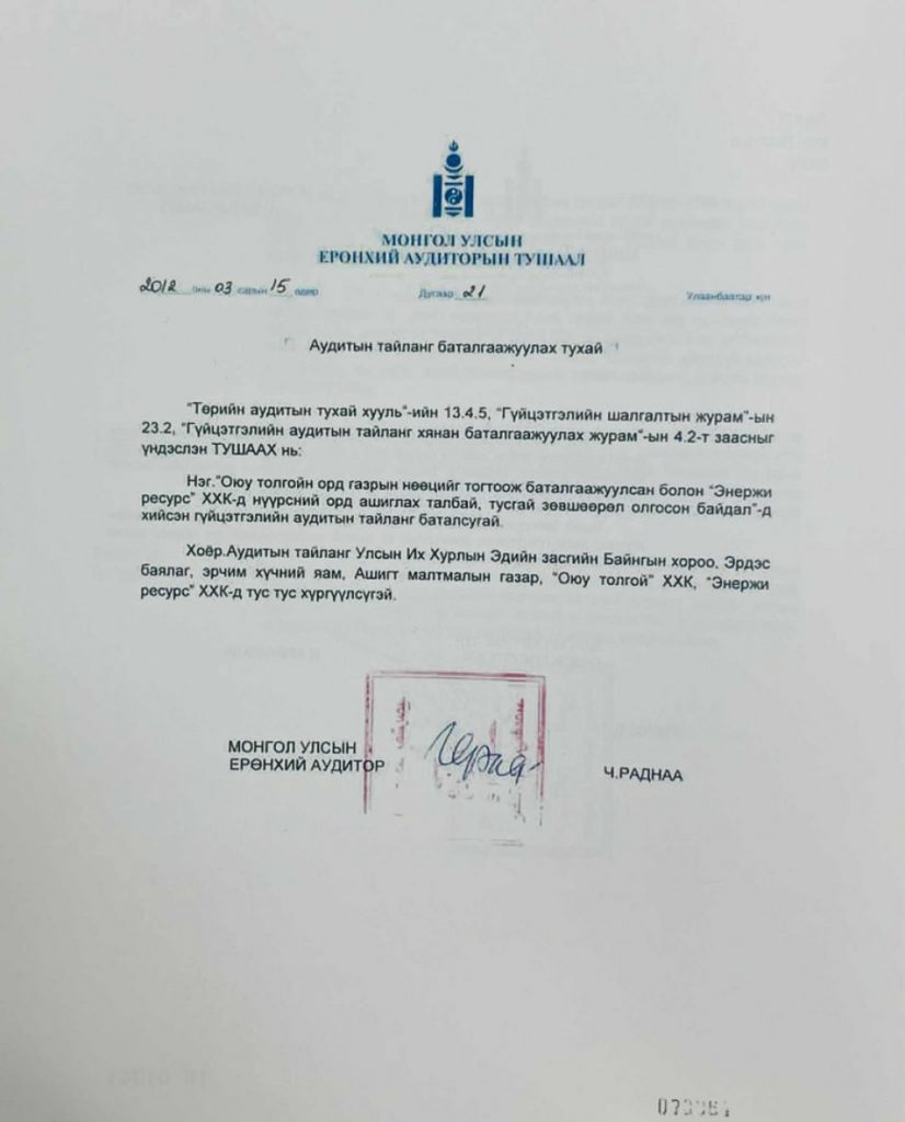 Тэгвэл 2008 онд явагдсан энэхүү хэлэлцээрийн үйл явц, хууль журмын хэрэгжилт дээр Үндэсний аудитын газраас 2012 онд шалгалт хийж, аудитын дүгнэлт гаргасан болохыг “Тавантолгойн цагаан толгой” номонд баримттай нь бичиж нийтэлжээ.