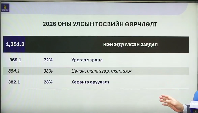 2026 оны төсөв УИХ-д өргөн баригдсанаас хойш салбаруудад гарсан өөрчлөлт нийт дүн бол 1 их наяд 351 тэрбум төгрөг болж байгаа. Үүнээс 884 тэрбум төгрөг нь цалин тэтгэвэр, тэтгэмж нэмэгдэхэд зориулагдаж байгаа. Зөрүү 80 гаран тэрбум төгрөг нь бусад урсгал зардал дээр гарч байгаа ийм өөрчлөлтүүд байна.