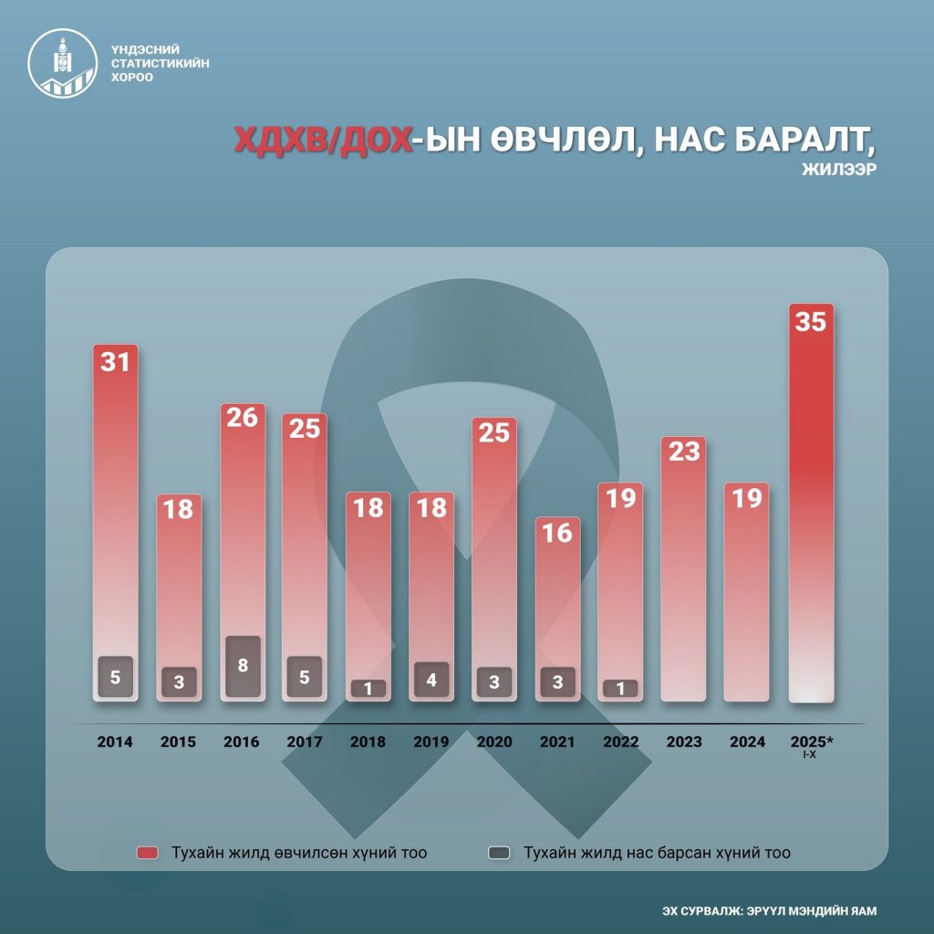 Түүнчлэн улсын хэмжээнд он гарснаас хойш ХДХВ-ийн халдварын тоо 36-гаар нэмэгдсэн бөгөөд жилийн эцэс гэхэд эл үзүүлэлт 48 болж нэмэгдэж болзошгүй гэсэн урьдчилсан таамаглал ч дэвшүүлээд байгааг дээрх уулзалтын үеэр мэргэжилтнүүд мэдээлсэн байна. Өвчлөгсдийн олонх нь 20-44 насныхан бөгөөд 99.7 хувьд нь бэлгийн замаар халдвар дамжсан байна.