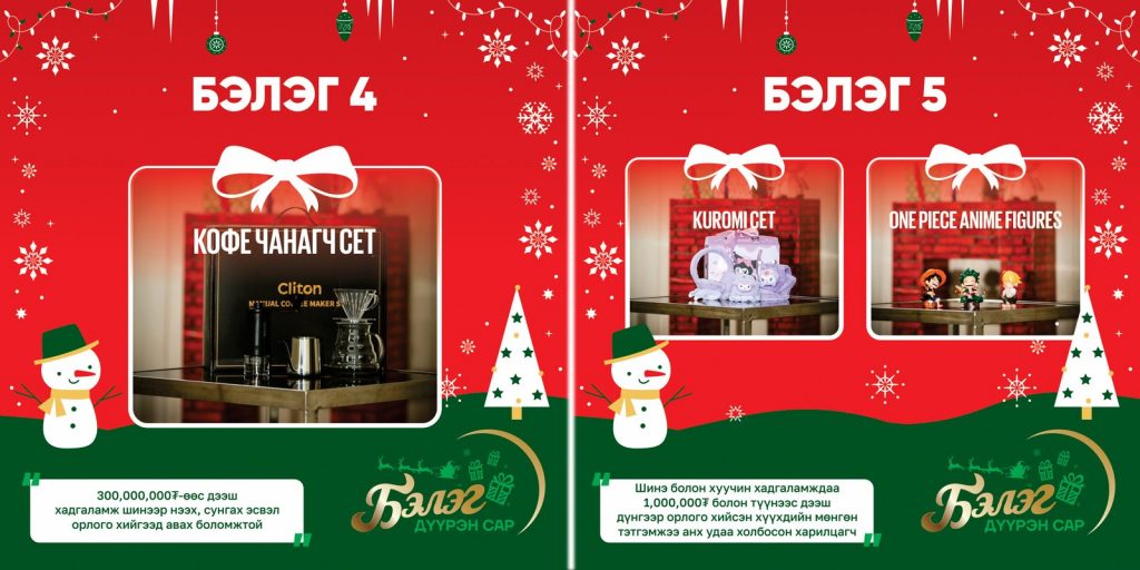 Хотын гудамжаар энэ тэндгүй гэрэлт гацуурын хөгжилтэй чимэглэл сэтгэл дулаацуулж, баярын уур амьсгал дэлгэрч, айл бүхэн аз жаргал, инээд хөөр цангинаж буй энэ өдрүүдийг илүү онцгой болгохоор Богд банк эрхэм харилцагч та бүхэндээ харилцагч бүрдээ бэлэгтэй “БЭЛЭГ ДҮҮРЭН САР” хадгаламжийн урамшуулалт аянаа хүргэж байна.