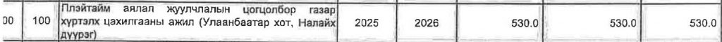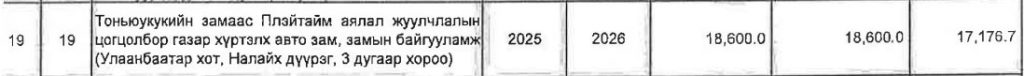 Тухайлбал Налайх дүүргийн 3 дугаар хороо, Тоньюукукийн цогцолбор газраас Плэйтайм аялал жуулчлалын цогцолбор хүртэл 8.4 километр авто зам, зам байгууламжийг 17.1 тэрбум төгрөгөөр барих аж.