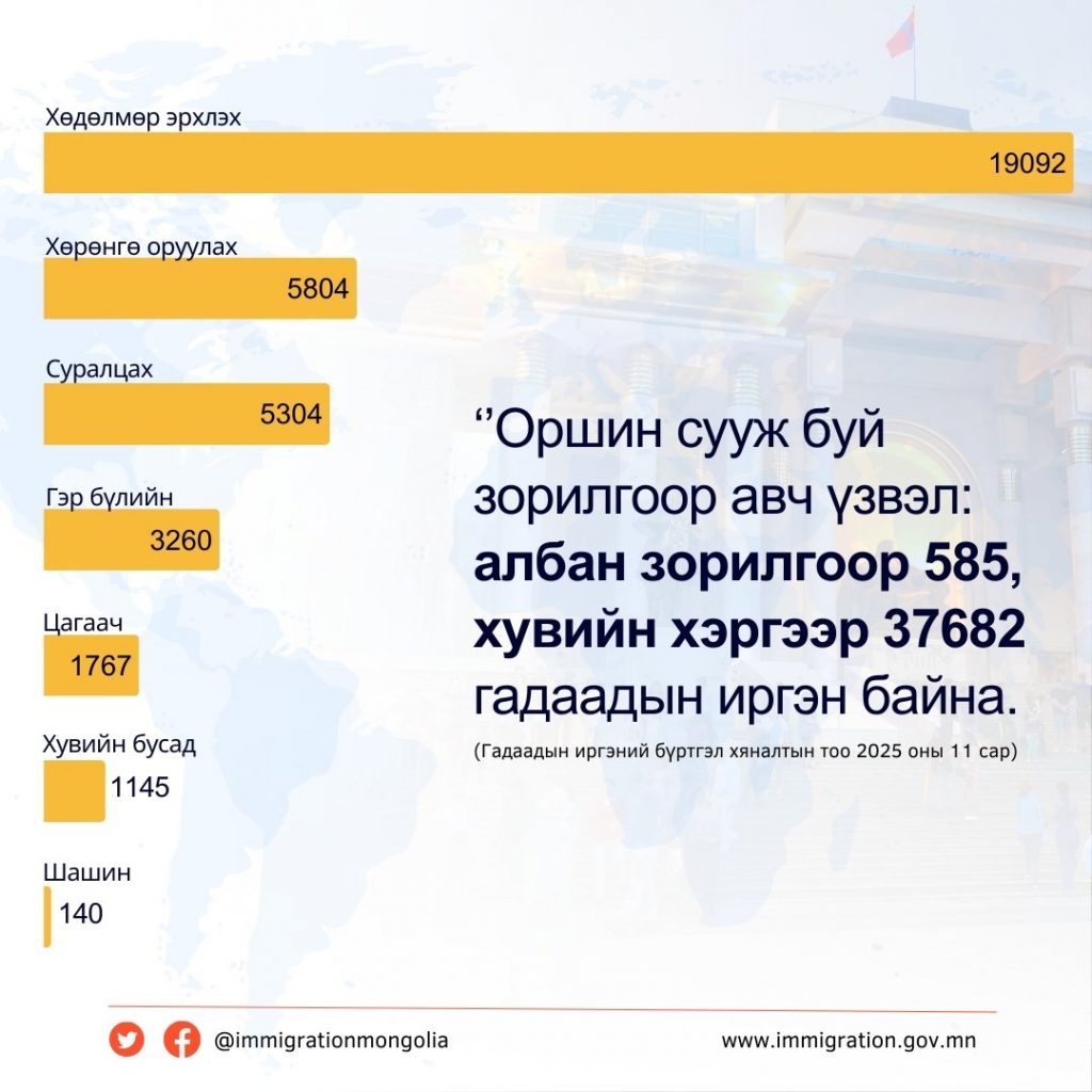 Монгол Улсад 2025 оны арваннэгдүгээр сарын 30-ны өдрийн байдлаар 138 улсын 37,097 гадаадын иргэн албан болон хувийн хэргээр оршин суух бүртгэлтэй байна. Эдгээр иргэдийг улсаар нь авч үзвэл АНУ-ын 1,175, БНСУ-ын 1,777, БНЭУ-ын 2,278, ОХУ-ын 3,020, БНХАУ-ын 22,868, иргэн, бусад улсын 5,979 иргэн байна.