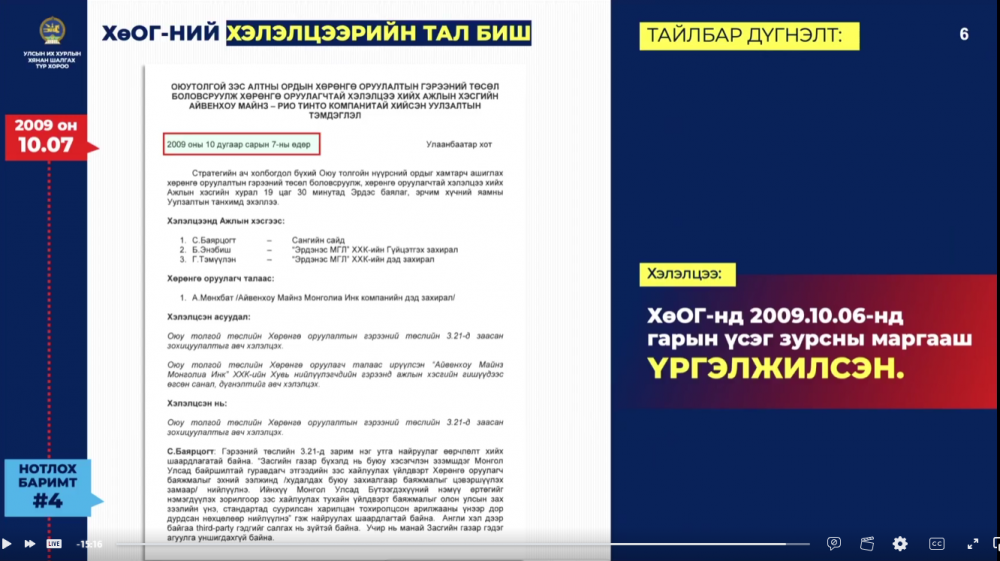 Энэ нь хэлэлцээр дуусаагүй байхад Хөрөнгө оруулалтын гэрээг байгуулсан байна. Тодруулбал, өчигдөр нь баталсан ХОГ-ний 15 зүйл заалтыг, Хувь нийлүүлэгчдийн гэрээний 6 заалтыг өөрчлөх асуудлыг хэлэлсэн.