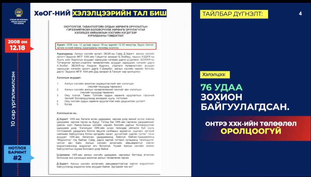 “Оюутолгой бүлэг ордын ашиглалтад Монгол Улсын эрх ашгийг хангуулах, хүртэх өгөөжийг нэмэгдүүлэхтэй холбоотой баримт бичиг, үйл ажиллагаанд хяналт шалгалт хийх” түр хорооны сонсгол /Оюутолгойн сонсгол/ “Онтрэ”-гийн эзэмшлийн Жавхлант, Шивээ толгой лицензи Оюутолгойн хөрөнгө оруулалтын гэрээнд хамаарах эсэх асуудлаар үргэлжилж байна.