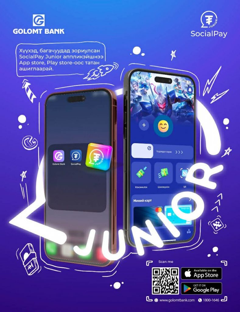 SocialPay Junior аппликэйшн нь 8-18 насны хүүхэд, залуучуудад зориулж тусгайлан бүтээсэн төлбөр тооцоо, шилжүүлэг, нэхэмжлэл, виртуал карт, дата нэгж, тоглоом, тасалбар, дэлгүүр болон олон төрлийн хөнгөлөлт урамшууллыг багтаасан хамгийн шилдэг сүпер аппликэйшн юм.