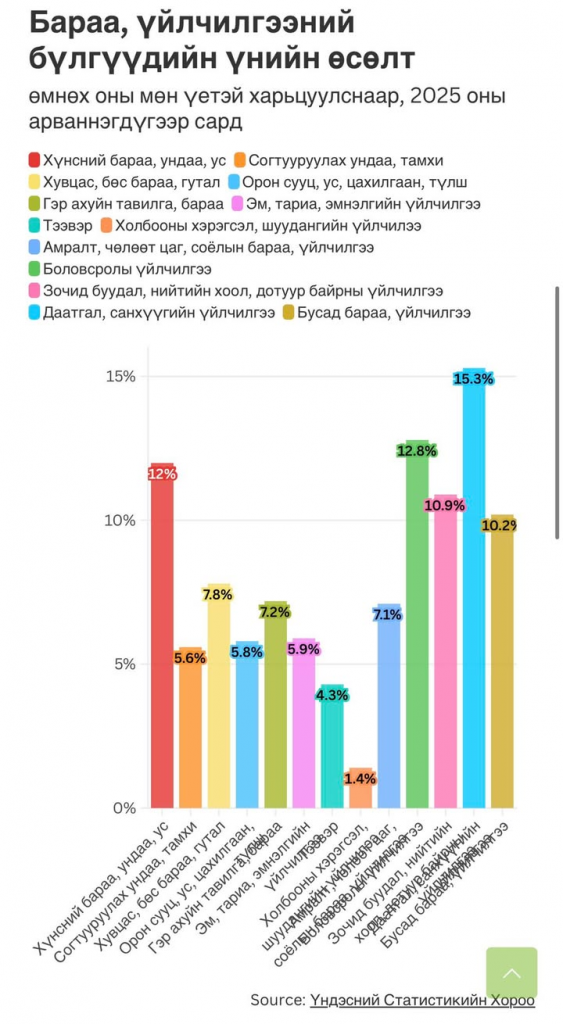 Хэрэглээний бараа, үйлчилгээний үнэ 2025 оны арваннэгдүгээр сард улсын хэмжээнд өмнөх оны мөн үеэс 8.2 хувиар, өмнөх сараас 0.6 хувиар тус тус өссөн гэж Үндэсний Статистикийн Хороо(ҮСХ)-ноос мэдээлэв.