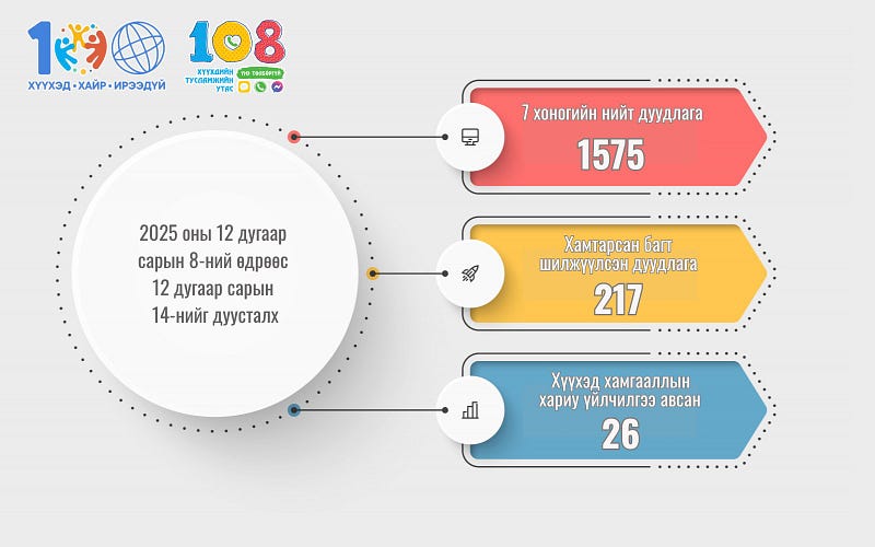 Хүүхдийн тусламжийн 108 утсанд долоон хоногийн хугацаанд 1575 дуудлага иржээ