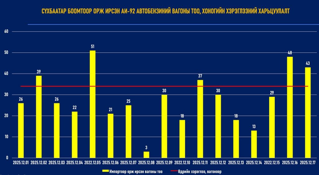 Монгол Улс өдөрт 34-35 орчим вагон 2,200 орчим тн шатахуун хэрэглэдэг байна. Энэ оны 12-р гарснаас хойш Сүхбаатар боомтоор орж ирсэн АИ-92 автобензиний вагоны тоог доор графикт харуулжээ. Өдөрт дунджаар 30 орчим вагон орж ирж байгаа аж.