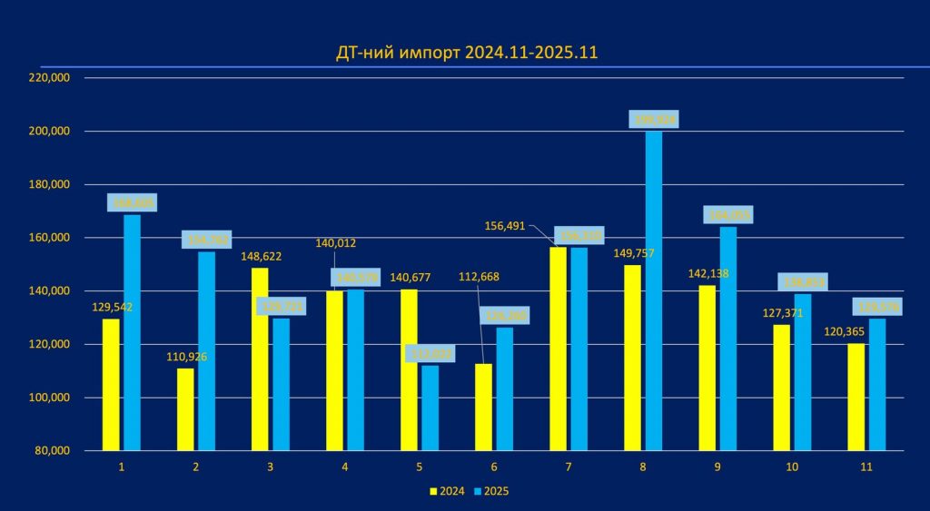 Дизель түлшний импортыг 2024 оны 11-р сар хүртэлх тоог 2025 оны 11-р сар хүртэлхтэй харьцуулсан график. Тодруулбал уул уурхайн идэвхжил ихтэй 7,8,9-р сард урьд өмнө импортолж байснаасаа илүү их бүтээгдэхүүн импортолсон байна.