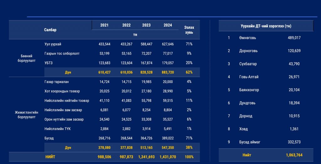 Монгол Улсын шатахууны хэрэглээний 62 хувийг уул уурхайн салбар дангаараа хэрэглэж байгаа аж. Уул уурхайн салбарын өсөлттэй холбоотойгоор бүтээгдэхүүний хэрэглээ цаашид ч нэмэгдэнэ гэв. Энэ жил шатахууны хэрэглээ 3 саяд хүрэх тооцоотой байгаа ба ирэх жил манай улс 100 сая тн нүүрс экспортлох зорилтын улмаас шатахууны хэрэглээ 20 хувиар нэмэгдэх магадлалтай гэсэн тооцоо гарчээ.